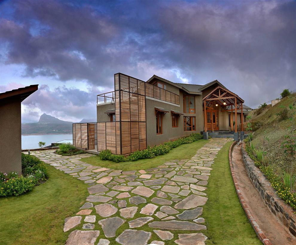 Famous for its captivating vistas, Pavana is as much a getaway as it is a pristine landscape – landlocked by the Sahyadris, crowned and guarded by three forts. The lake, a man-made marvel, held back and contained by a towering dam plays host to a wide gamut of activities throughout the year – an emerging hotspot for tourists and nature lovers alike. The family of four sought to discover a weekend retreat as well as a reprieve from the bustling life of the city, and hence ventured out in search of a tract of land that would not only capture the essence of the place but could also inspire, delight and satiate their creative endeavors. Snaking its way up a steep slope riddled with hairpin bends that overlook the range, the site rests as a proud marker – evocative and majestic, overlooking the shimmering lake in the distance. The house on top of the hill, reminiscent of the forts in the horizon, revels in its ability to become one with the land and is a pure reflection of the realm that surrounds it. Conceived as a home for friends as much as it was a home for family, the 5 Element House is a place for celebrating life itself.