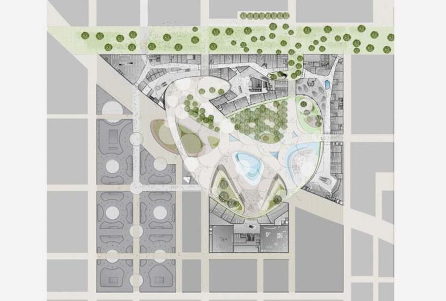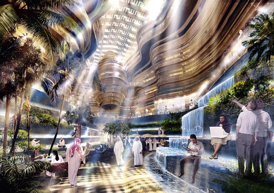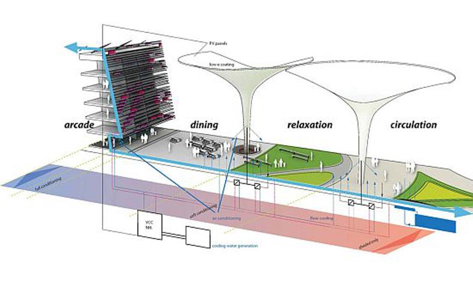 Water, stored underground during the day, is planned to be released through water features at night, allowing it to trickle or flow heavily in response to movements of passers-by. Roof gardens will be integrating food production, energy generation, water conservation and re-use of wastes.