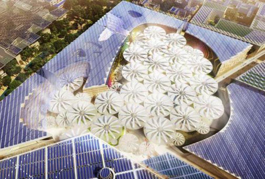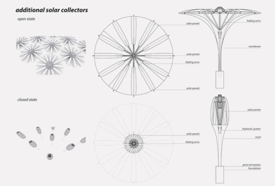The centre will include an open air plaza surrounded by a five star hotel and other hotels, convention centre, recreational and retail facilities and remain open for public use 24 x 7. This plaza will be shaded during day by a field of open giant sunflower umbrellas, which will simultaneously collect and store heat, and fold up during night to release the stored solar energy to light up the premises. These umbrellas, providing sun-shade by following the sun’s projections, are a prototype that can be replicated anywhere in the world and open up opportunities for outdoor living according to LAVA principals Chris Bosse, Tobias Wallisser and Alexander Rieck.