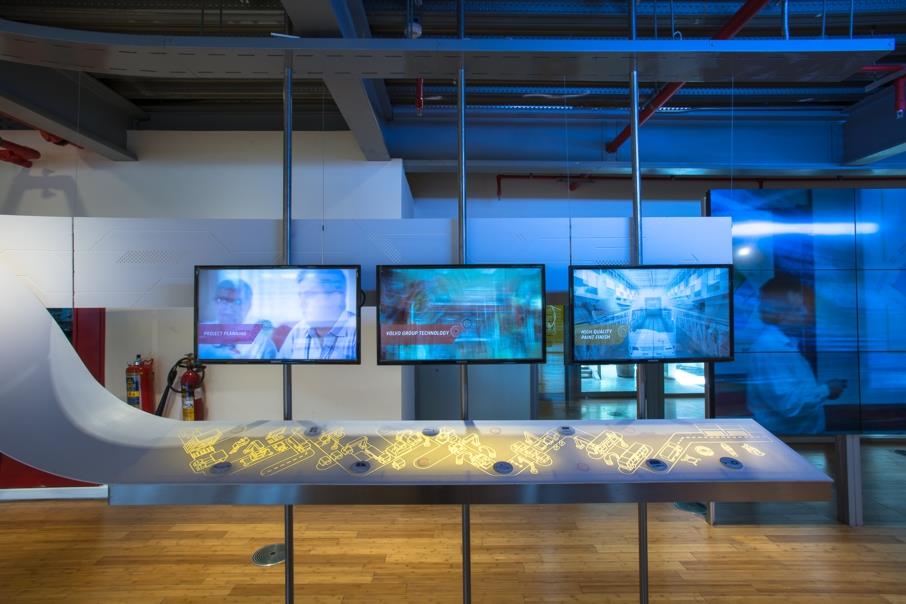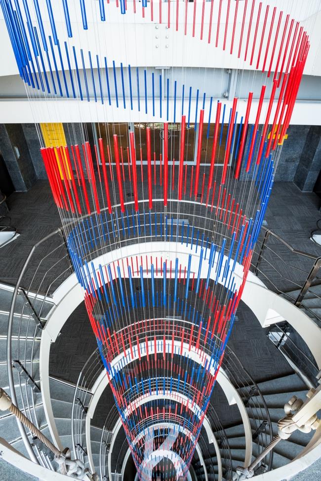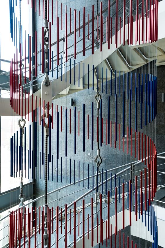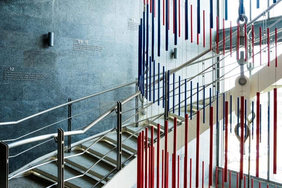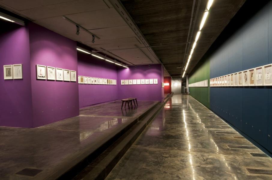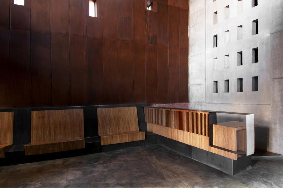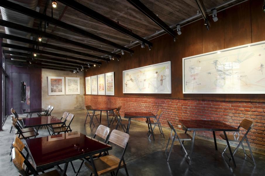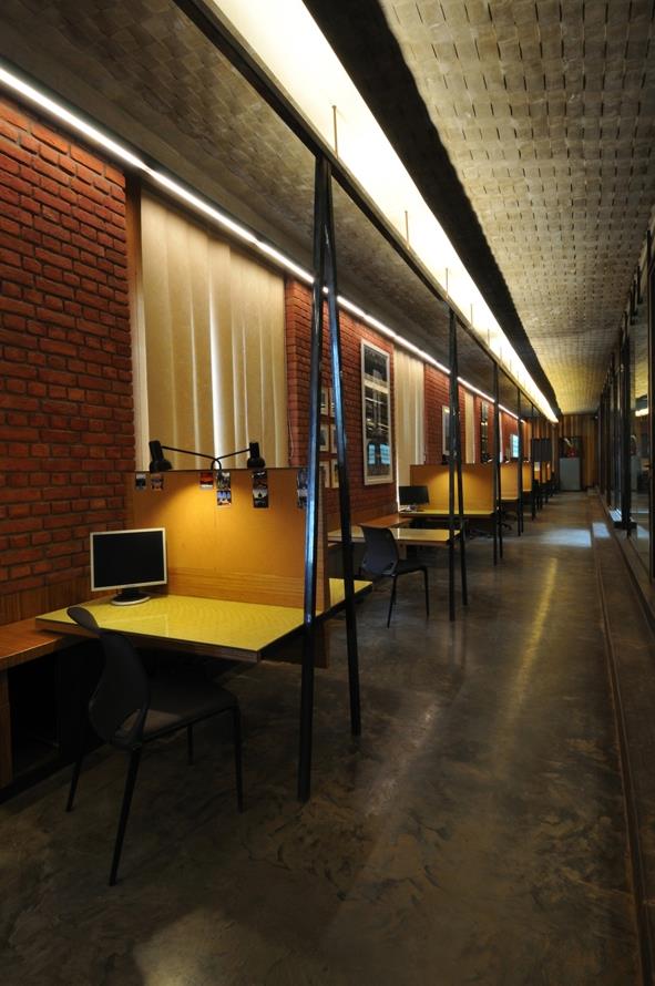 With almost no partitions, the interior layout truly opens out as a spacious expanse in all areas, providing continuous wall surface to exhibit the firm’s exclusive art collection. As a representation of the firm’s business of paper, the furniture such as seats, desks, cabinets and workstations have been crafted like pieces of origami art with the sandwiched plywood sheets seeming to fold up angularly into the required forms. This paper-folding of plywood sheets is supported with steel frame-work to sync with the steel exteriors and some interior walls, with steel sections crossing overhead as the ceiling too. Mirror and clear glass sandwiched with film form the café and reception table tops, which contrast elegantly with the vacuum dewatered raw look of the flooring. The work space walls alternate between finely detailed exposed brickwork, smooth or textured concrete, panels of steel and plywood panelling in varying gradients to create a charming earthy aura. Colour appears in all its brightest hues only on the long, unending walls of the art gallery, the single file display of art works teaming up with the single row of linear ceiling lights and the single room-length step running down the middle of the floor to create a dramatic directionality. Strings of exclusive origami suspended from the ceiling or other paper crafts placed on counters are the ornaments of decoration used in this unpretentious interior.