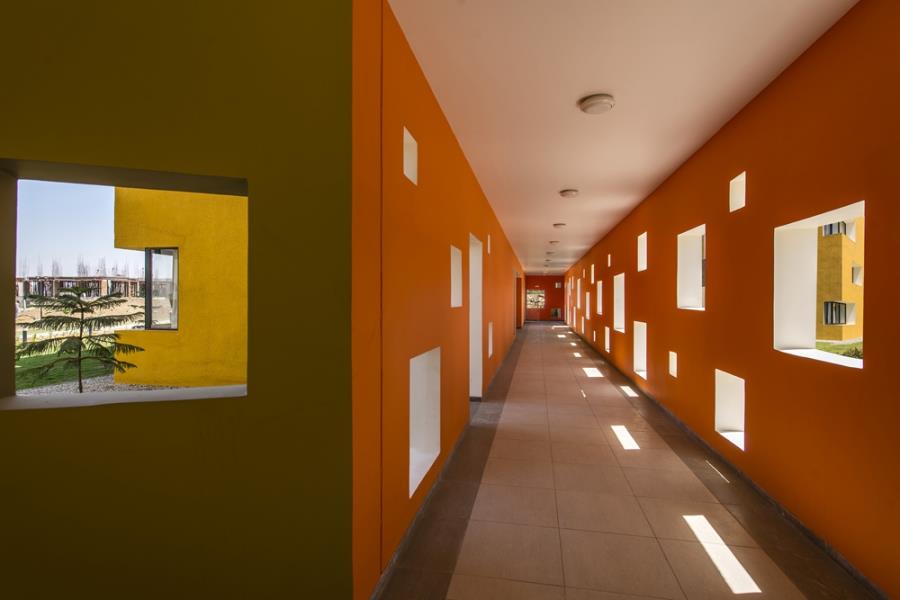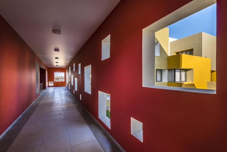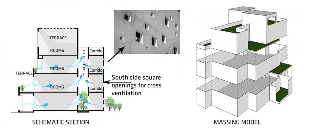 The circulation spaces connecting the housing blocks are naturally ventilated with an abstract composition of square punctuations on either side facilitating air to move through. The harsh glare of the sun is cut off; yet allowing natural light within the linear corridors, and creating different patterns at different times of the day.