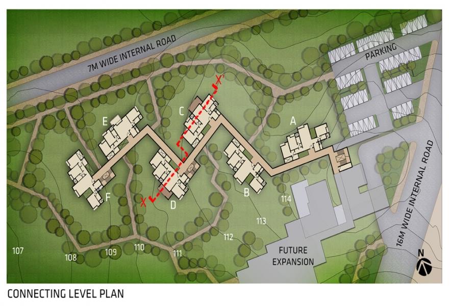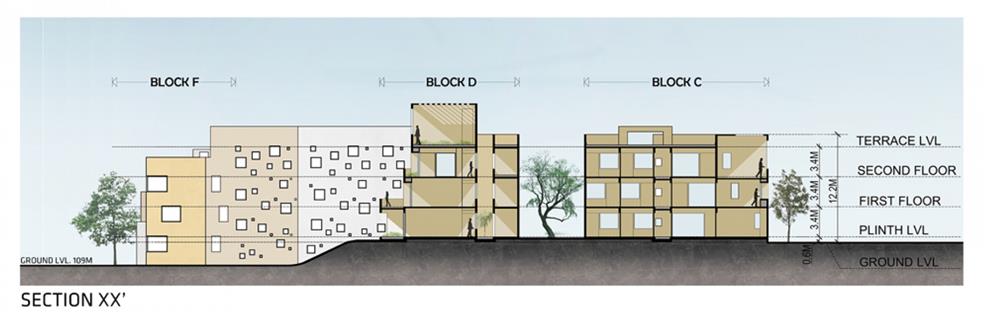 The design of the cluster of blocks with a total of 18 studio apartments takes a cue from the organic layouts of the neighbouring villages near the site, with the residential units interspersed within the existing contours along organic streets that weave through the site. Much like old Indian cities, the layout sees the low-rise blocks stepping back and creating interlocked built volumes across three levels.