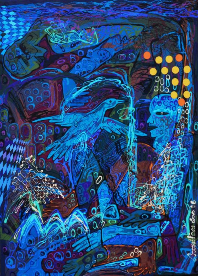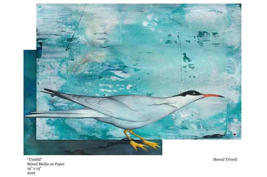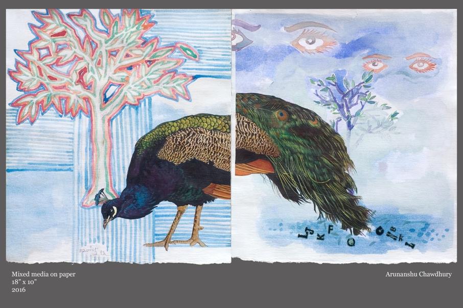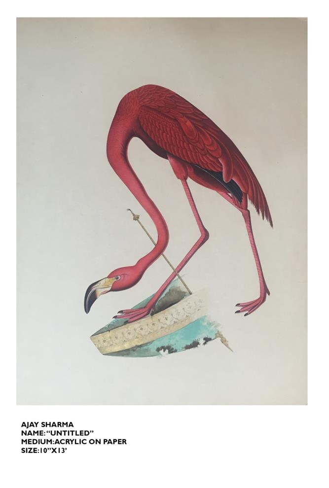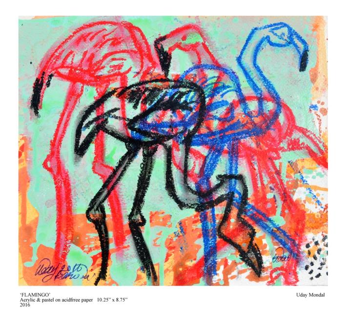 Prasanta Sahu’s Acrylic on Canvas titled ‘Blueprint of a Wing’ (img 7) evokes the wing’s similarities (or otherwise) with a human hand raising, perhaps, the question as to which one is more able. Abhay Gaikwad’s muffler-ed duck in his work which features on the invite (img 5) as well seems to hint at the irony of most natural forms needing protection in a world abused by human greed. Arunanshu’s fragmented peacock (cover image) has its front half enjoying being a free-spirited part of a scenic natural world, while its rear half with its attractive feathers is under the dangerous gaze of human consumerist greed. Uday Mondal’s ‘Flamingos’ (image 11) captures various nuances of the graceful bird in a single frame, Heeral’s untitled mixed media creation on paper lucidly articulates the graceful long body of a Tern appearing to float through different landscapes (image 8).