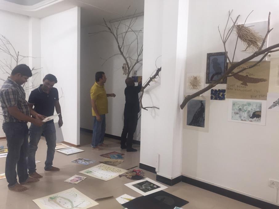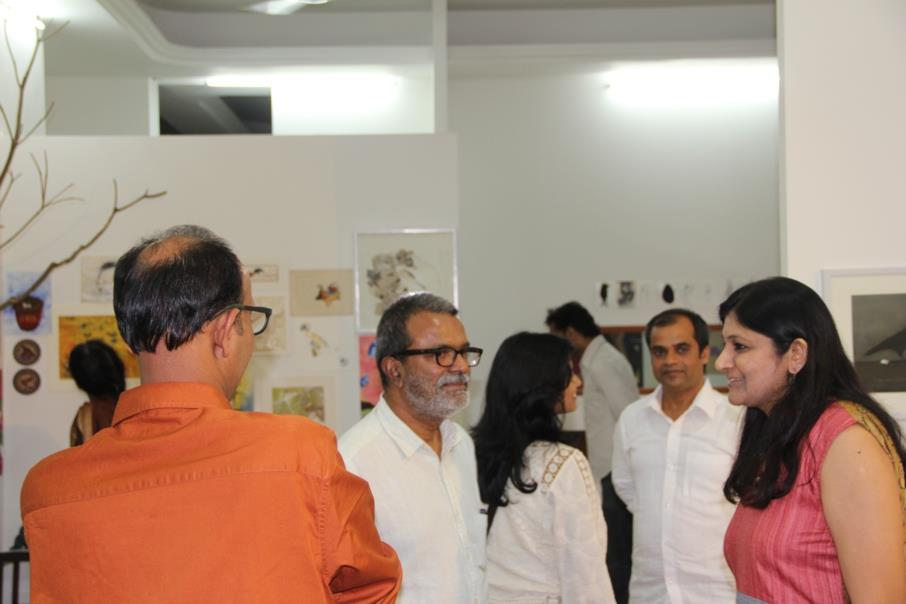 The Fine Arts faculty of the Maharaja Sayajirao University, one of the premier art institutes in the country, obviously logged the maximal participation in this event with veterans, former and present students and faculty displaying their works. Many artists from other parts of the country like Delhi, Mumbai, Chennai, Jaipur and Shanti Niketan were also invited to display their art works centred on the avian theme, with some even coming forward with requests to participate. The event which opened to a spontaneous crowd of 200 visitors at the traditional inaugural (img 13)on the evening of 4th March 2016, went on to see a steady and overwhelming stream of patrons over the next four days, attracting even tourists visiting Baroda at the time.