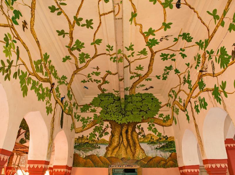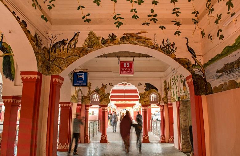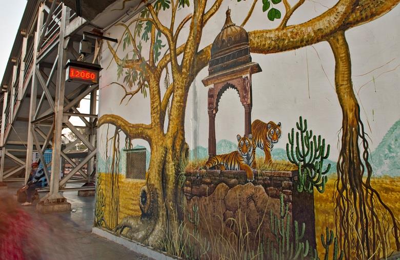 The legendary banyan tree that has a spread over a couple of kilometres of Ranthambore is depicted over the walls, pillars and ceiling of the arrival porch, along with all the creatures that take refuge in it, creating a splendorous welcome. The scheme also includes painting the Bharatpur Station with scenes from the Bharatpur Birds Sanctuary, as well as the coaches of the Kota-Nizamuddin Jan Shatabdi which is the train bringing in the bulk of tourists from New Delhi.