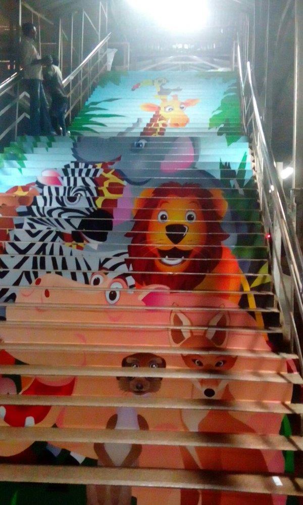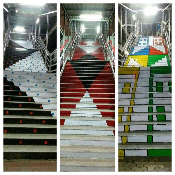 As if on cue from Rajasthan, Mumbai city recently witnessed the initiation of a similar drive to clean up and decorate some of its famously filthy local train stations with artistic contributions, mostly from the student community. With some initial experimentation at Matunga Station, leading the way were Borivali and Khar, where 500 volunteers of the ‘Make A Difference’ (MAD) foundation decided to paint the staircases, pillars and walls with vibrant colours and vivid scenes of landscape, animals, games and patterns. The purpose of this was, beyond just cleaning up once, to beautify and liven up the place such that it invokes a sense of ownership and responsibility among the users, consequently restraining them from littering the public space and inspiring them to make positive contributions towards its upkeep.