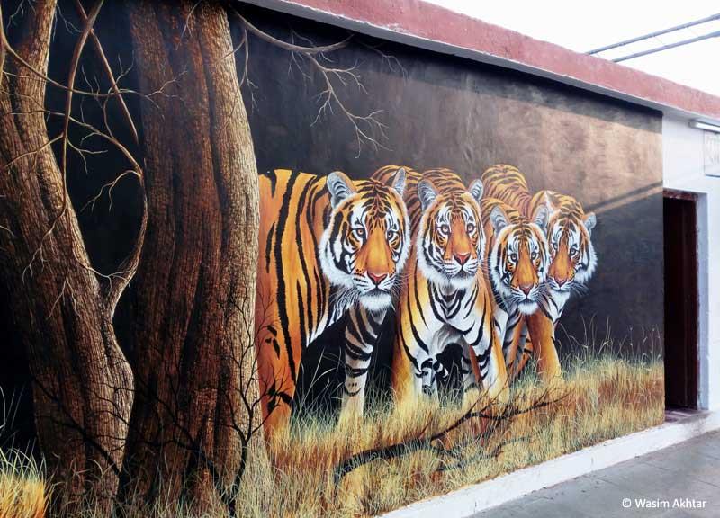 Being the gateway to the Ranthambore Tiger Reserve in Rajasthan, Sawai Madhopur town receives many tourists, who arrive by train at its tiny railway station. The World Wildlife Fund – India (WWF-I) and well-known conservationist Valmik Thapar conceptualised an idea to make this station an apt gateway to the Reserve, which they proposed to and accepted by the Western Railways through the favourable support of the Chief Minister Smt. Vasundhara Raje Scindia. Funded by the WWF-I and supported by the Indian Railways, a group of 20 local artists let by Shri Gajendra Singh has thence worked for close to two months to paint the 7000 sq. ft. of walls at this station, converting it into a vibrant art gallery depicting the wildlife of Ranthambore.