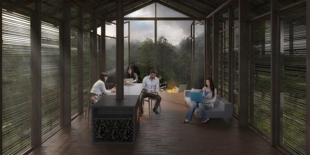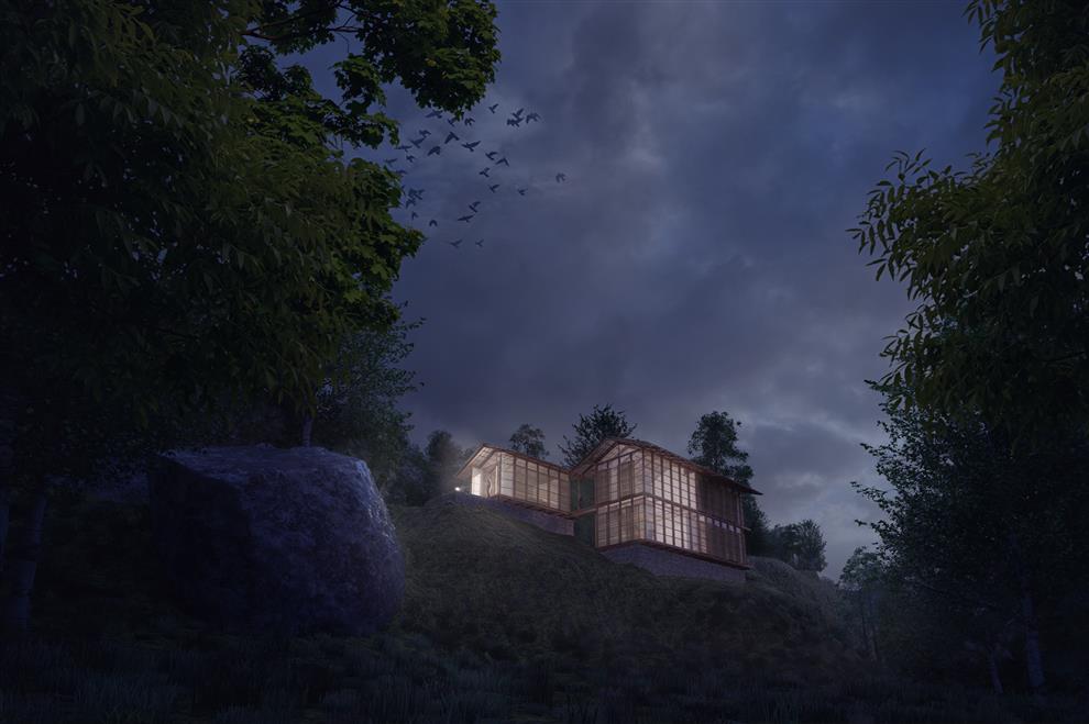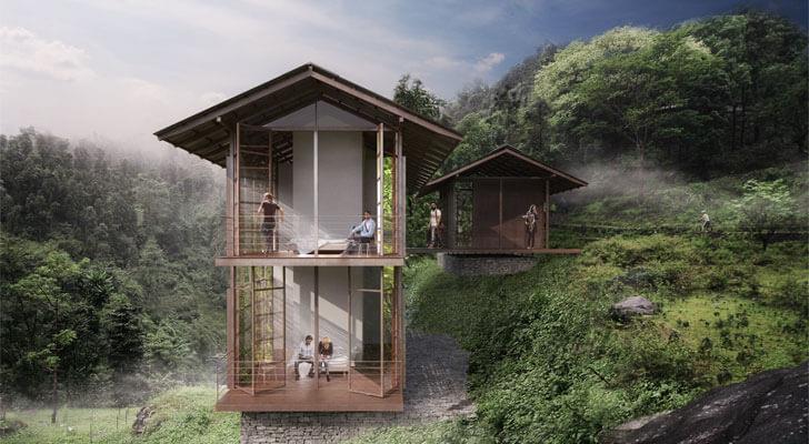 “The complex includes residential, business, sport, and farming facilities. The houses, built with local materials like stone, farmed teak and sissoo, reinterpret the verandas and overhangs of the vernacular architecture, protecting residents from extreme rain and sun conditions. Each unit can host three or four people at a time, with living space, studio, kitchen, two bedrooms and bathrooms. Built-in furniture serves as a focal point in each of the three volumes that compose the complex, creating a “living around the fireplace” model where all activities take place. The Retreat exemplifies the ongoing changes in our lifestyle facilitated by the emergence of global communication networks. High-speed Internet connection and extensive teleworking facilities permit international travellers to stay for longer periods of time at Pankhasari living in one of the planet’s most remote and beautiful corners while at the same time engaging with communities around the globe.” reads their official release statement.