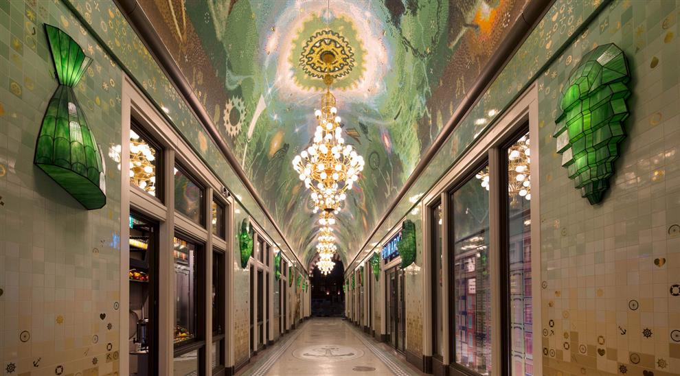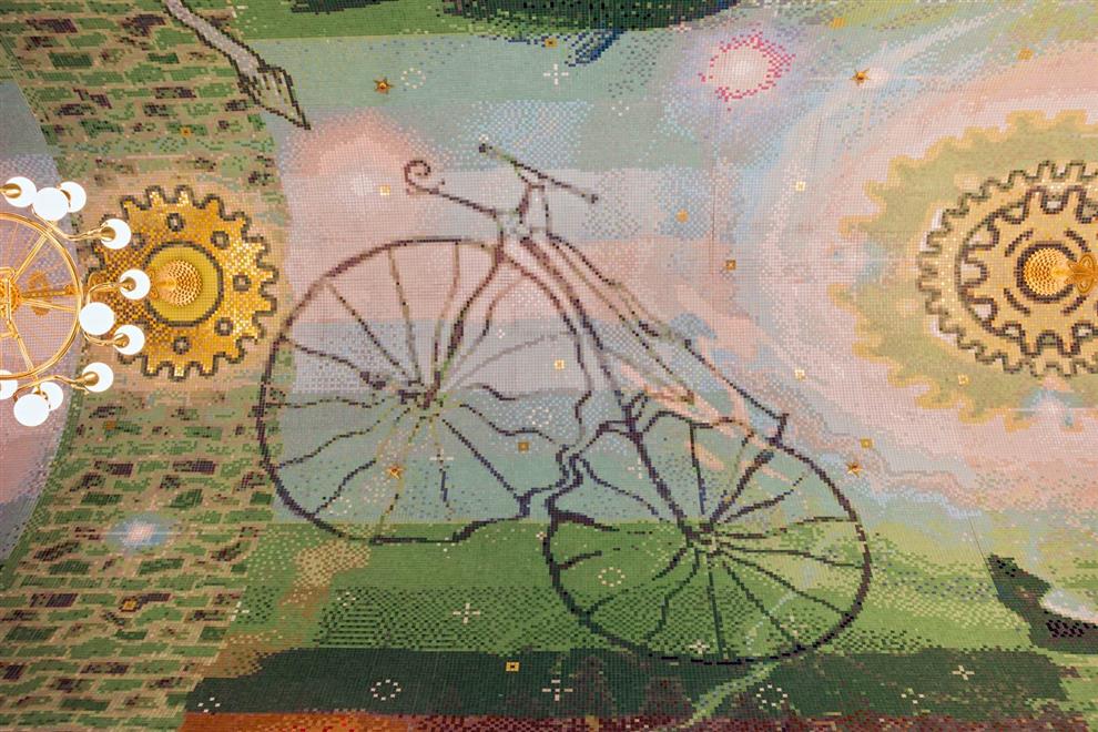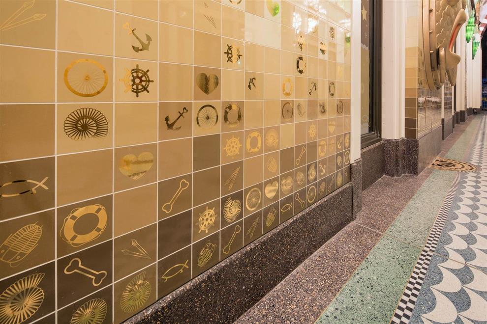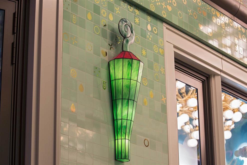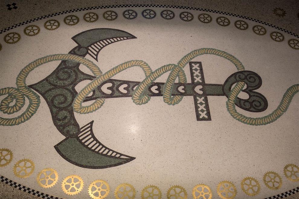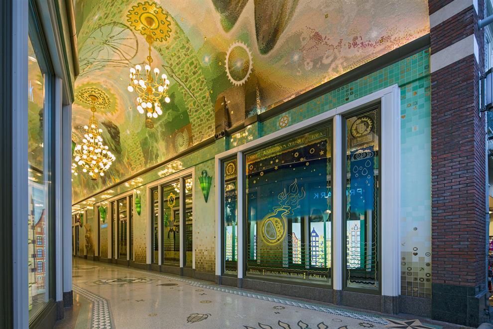 The lighting in the passageway is uniquely designed too! Seven chandeliers in three different styles: two large ones (named ‘Rembrandt’), one middle size (the ‘Vermeer’), and four smaller ones (named after ‘Ferdinand Bol’) are made of recycled bicycle parts, such as gears, head lamps, and handlebars – in tribute to the Dutch tradition of cycling. Besides this, fourteen three-dimensional stained glass lamps are installed, which are inspired by classic portal lamps, still seen in the entrances of Amsterdam’s canal houses.