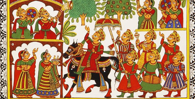 Globally acknowleged, Phad painting is a vibrant Indian folk art of Rajasthan. They have a very unique style and pattern and are most noted for the use of pulsating colours that bring the space to life. Their themes are historic in nature, depicting stories of the bravery of famous heroes like Prithviraj Chauhan, Goga Chauhan, Amar Singh Rathore, Papuji etc. The specialty of the painting is the two dimensional figures and neat arrangement of pictures in segments. An interesting aspect of the Phad paintings are the traditional singers named Bhopas, who narrate and sing the theme depicted by the painting, when these paintings are moved from place to place.
