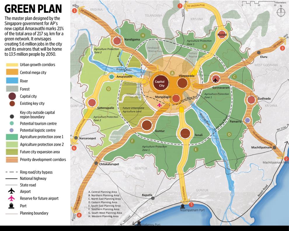 After new political boundaries were drawn two years back, Andhra Pradesh lost its State Capital Hyderabad to the newly formed state of Telangana. Andhra Pradesh therefore needed a new Capital and sought assistance from the Singapore government to draw up a masterplan. The three layered (seed capital, capital city and capital region) master plan for ‘Amravati’ has been prepared by Singapore government agencies - Centre for Liveable Cities (CLC), Singapore Cooperation Enterprise, and Surbana who delivered a 217 sq km master-plan.