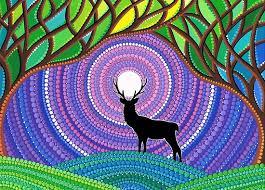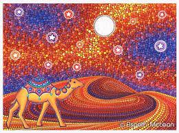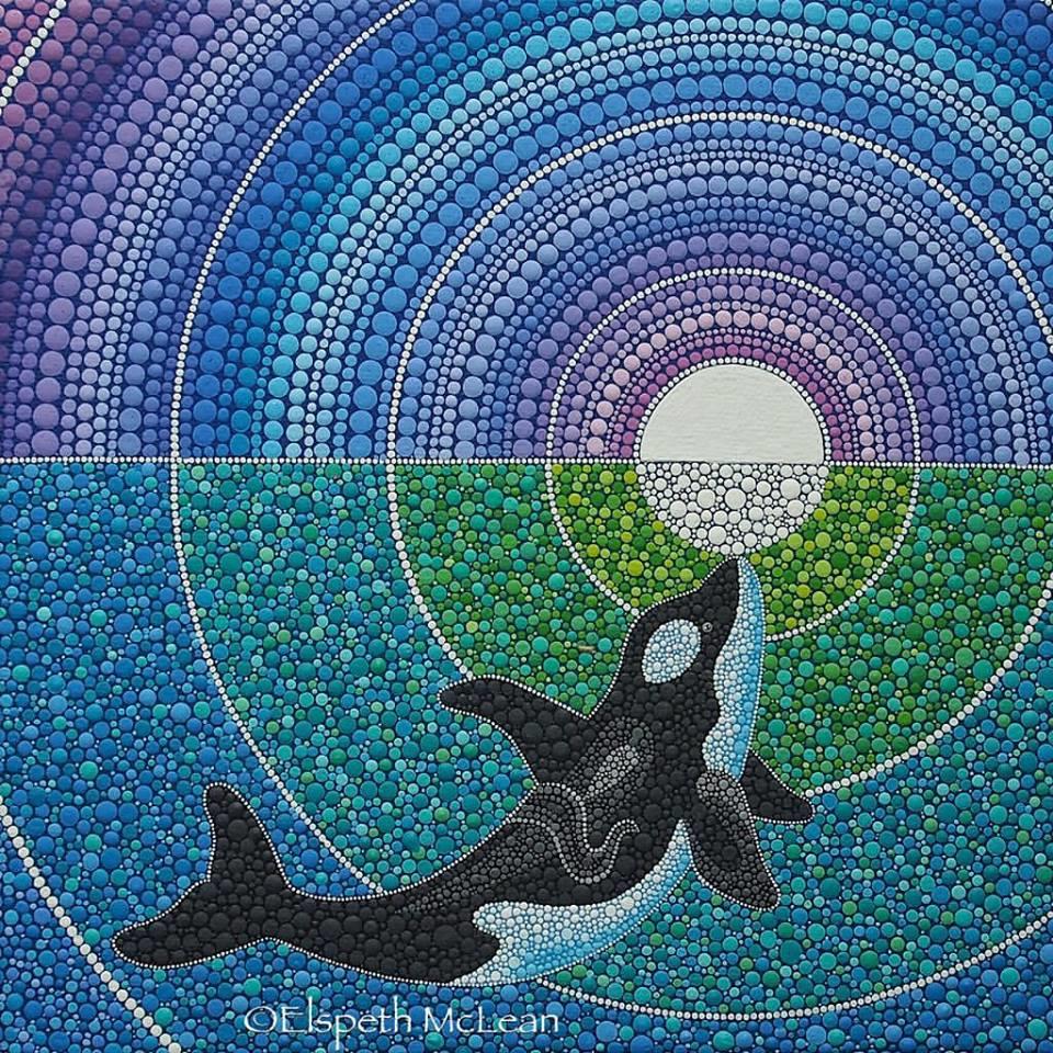 McLean is certainly inspired by nature; her paintings depict nature – in all its glory. The sublime beauty of a moonlit night, the meditative bliss of a rising sun, the expansive generosity of a massive tree, the meandering rivers, the majestic mountains – all find place in her paintings. Besides these, animals and birds, fish and reptiles too get ‘dotted’ in McLean’s dot paintings. Seen most often, and repeatedly, however is the whale – a magnificent creature she admits being very fond of, and often seeing even in her dreams!