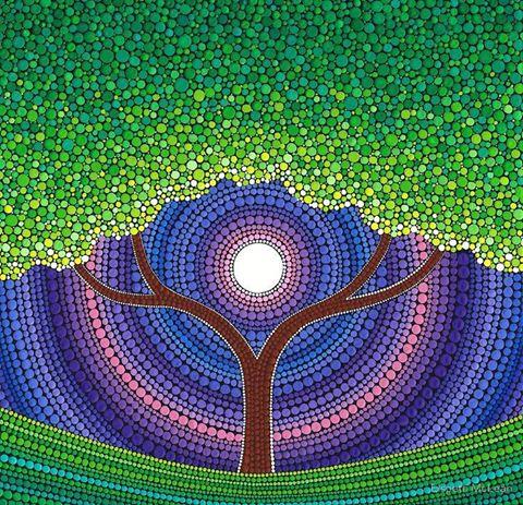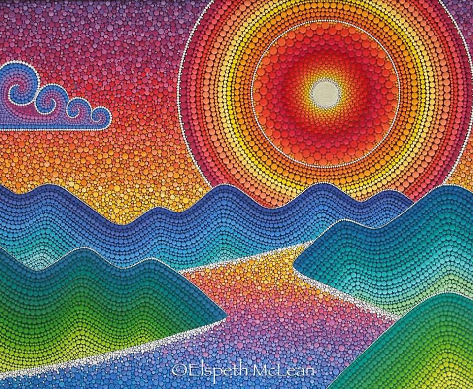 Raised in Australia, and now settled in Canada, Elspeth McLean is a tremendously gifted artist who creates intense and intricate artworks entirely out of colourful dots! So, there are big dots and small dots, and very tiny dots – but dots are all they are. Created with acrylic paint and a paintbrush, she has evolved a technique of creating vibrant and magical ‘dotty’ artworks, displaying a high level of skill and precision.