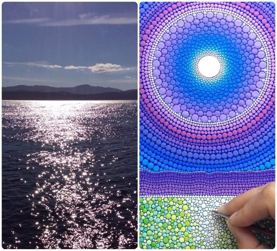 The Australian artist now living in Canada, however, does not claim to have invented this style of ‘dotty’ painting, but just feels blessed to “be part of a world-wide community that uses dots in their artwork.” And she also explains how the term “Dottilism” got coined. “For years when people asked what sort of artwork I created, I struggled to answer them. One day at an art event someone suggested the word “Dotillism”. It was an “aha!” moment. My artwork does not fall under the category of Pointillism (paint is applied to canvas in a way that the viewer eye mixes the colour). My artwork is not Aboriginal Art either. What we all have in common is that we use dots and we all use them in different ways. I use them as a decorative patterning and filling in instead of using brush strokes. So I began using the word “Dotillism” to describe my way of using dots.”