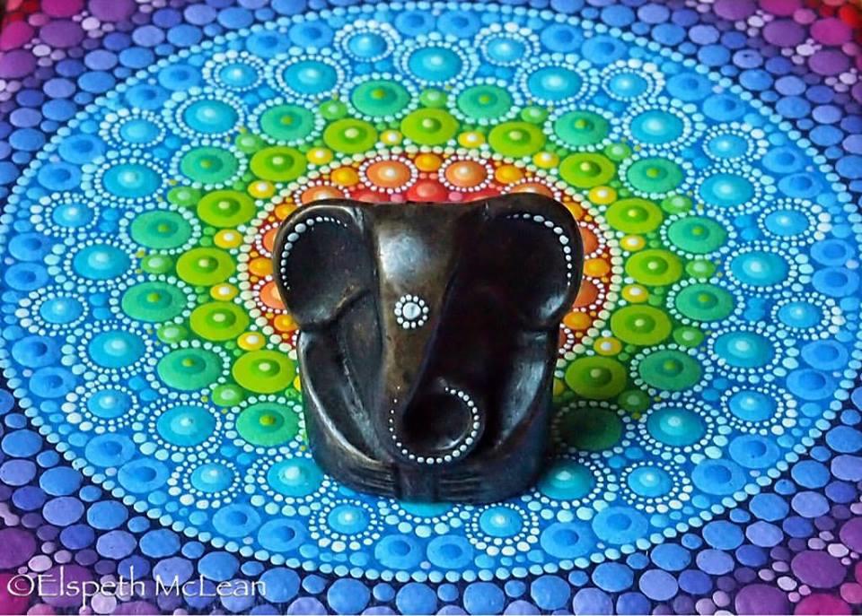 But besides paying obeisance to Ganesha and the Buddha, a large body of Elspeth’s work consists of Mandalas. Creating Mandalas everywhere – on canvases, on stones, on pendants and cushions – Elspeth is one of the few modern artists who have so fully explored the artistic and spiritual potential of this ancient Indian symbol representing the cosmos!