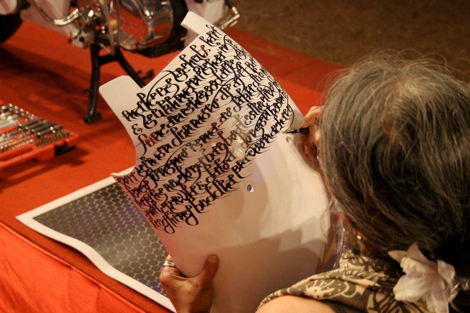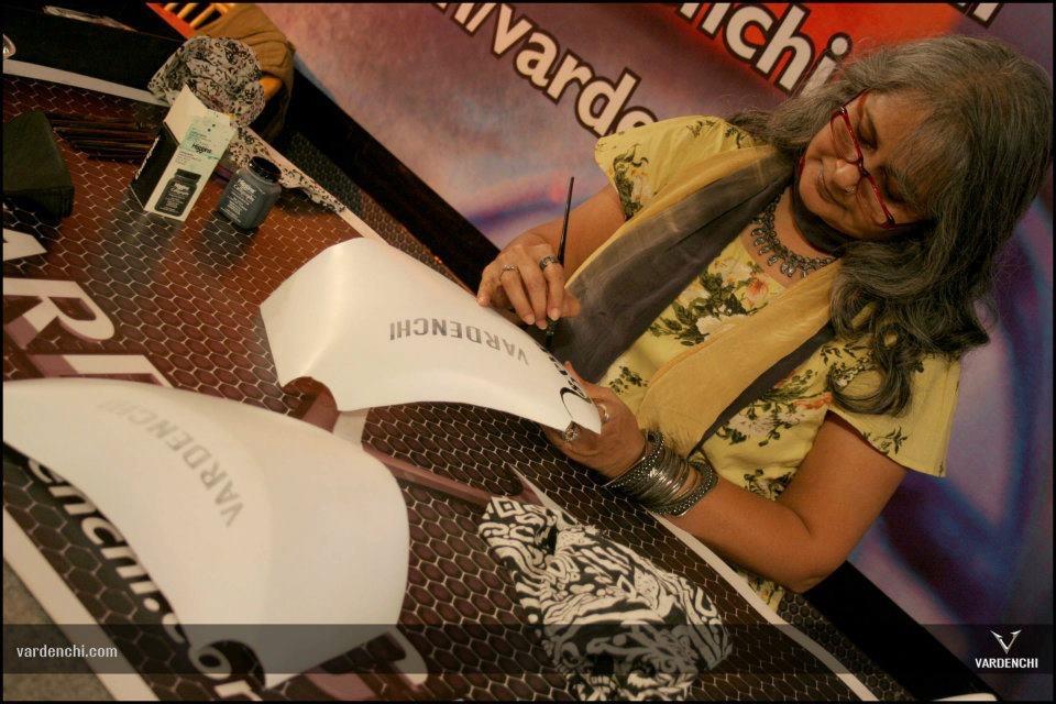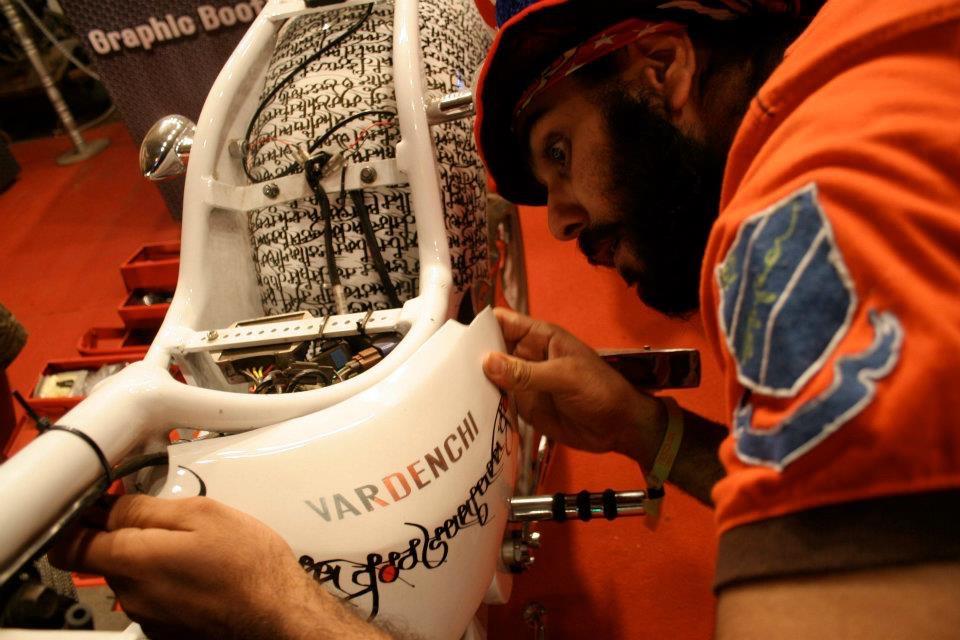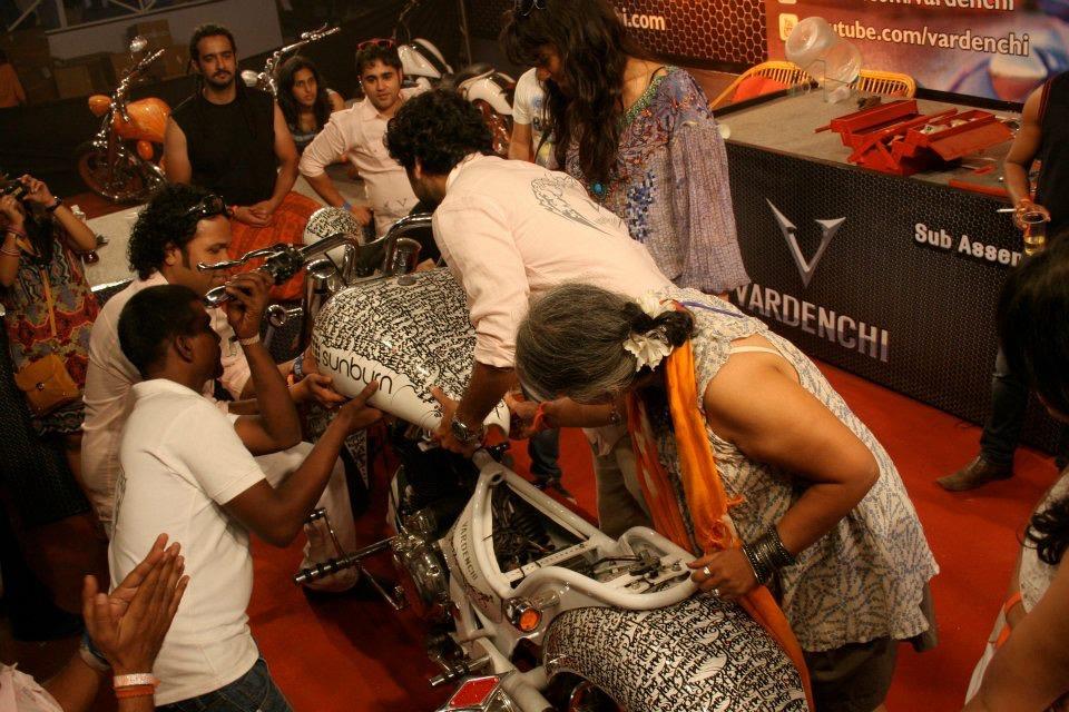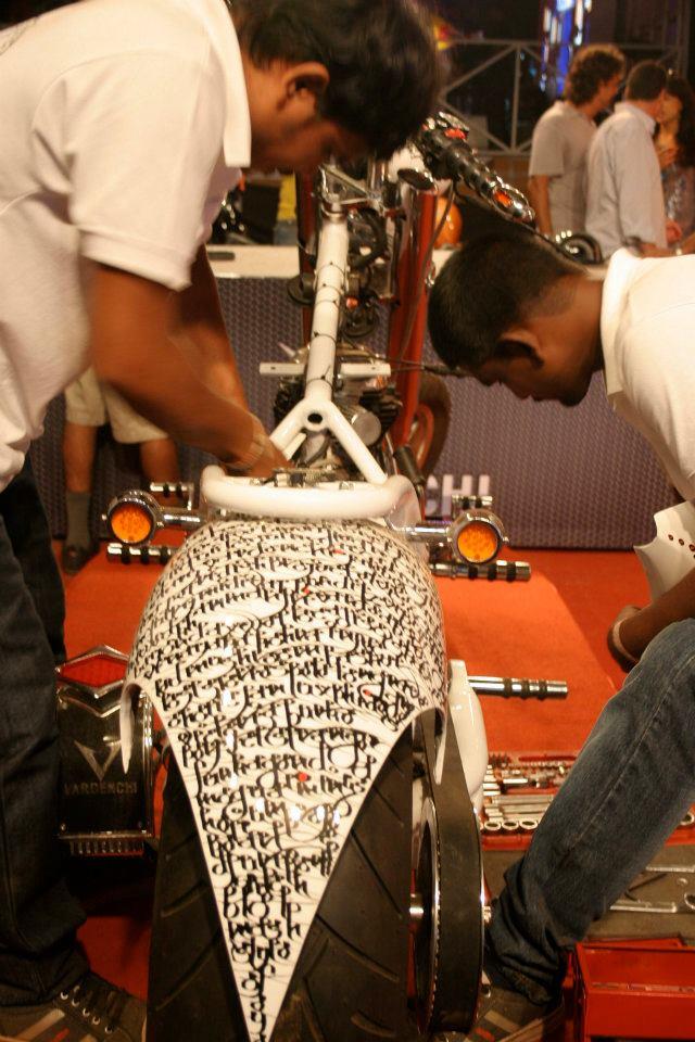 But although each Vardenchi is a stunning piece of metal and machismo, this one with Manjri’s calligraphic rendering is just a class apart! At a Sunburn festival hosted in Goa, a ‘Live Build’ event was organized where Manjri painted the Hanuman Chalisa on the bike in the presence of a large audience; and the bike was assembled right there! All the DJs and Bands that performed at Sunburn, were featured on the bikes.