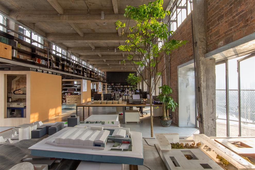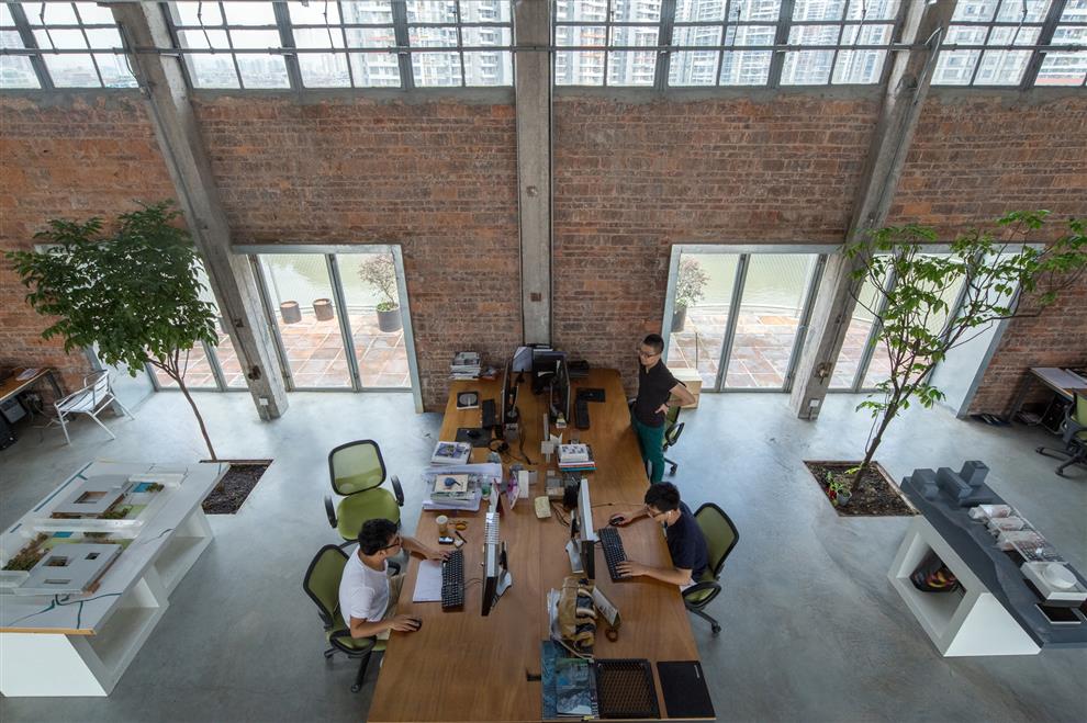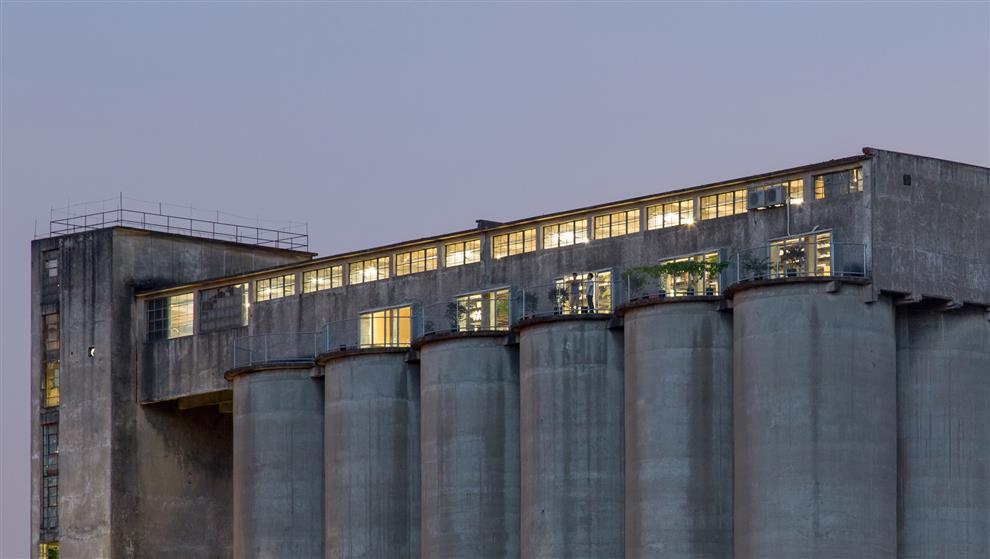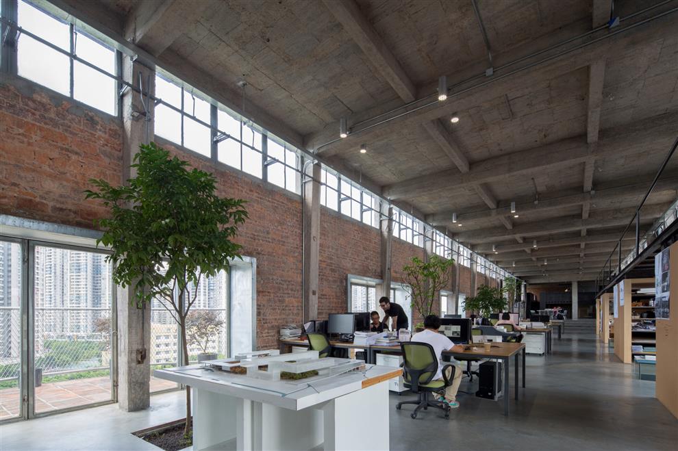 Who would ever think of a work space high on the top of towering grain warehouses?! O-Office Architects did! They located their office atop a cluster of 38 m high silos built in the 1960s, used earlier for storing the barley of a now defunct brewery in Guangzhou, China. What they got was a 38 m high plinth, a bird’s eye view of the city around along with one of the branches of the Pearl river flowing below and loads of natural light and ventilation with outdoor terraces as well, and not to mention, a considerable waiver of the cost (financial and otherwise) of constructing the structure, of course.