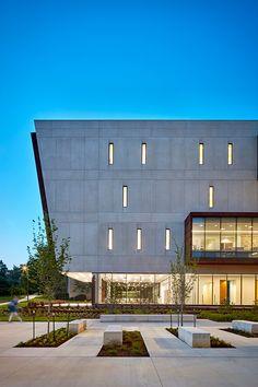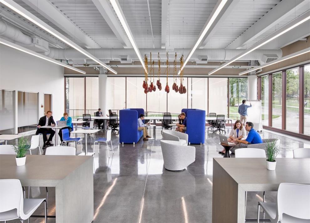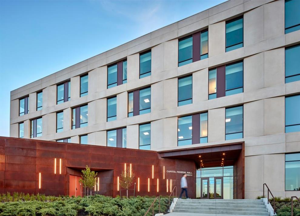 Capitol Federal Hall, as the business school building is called, is located on hilly terrain in Lawrence, Kansas. The invitation to converse begins at the façade itself, where the distinctive chocolate brown of massive swathes of weathering steel and bright white concrete boldly frame huge transparencies that beckon inside in open invitation, signature blue splashes charmingly glinting from within.
