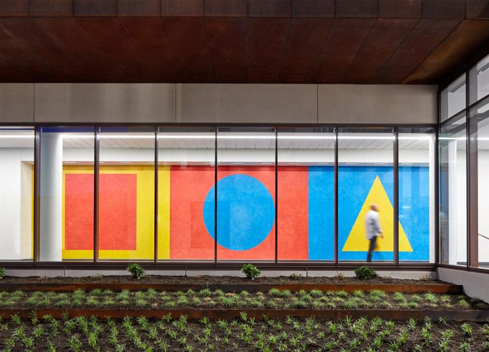The space is overlooked by staggered floors above, having mutually disconnected classes, tutoring stations, conference rooms, lounges and work rooms connecting visually across this atrium through their glass walls and adding to the interactive synergy of the building.