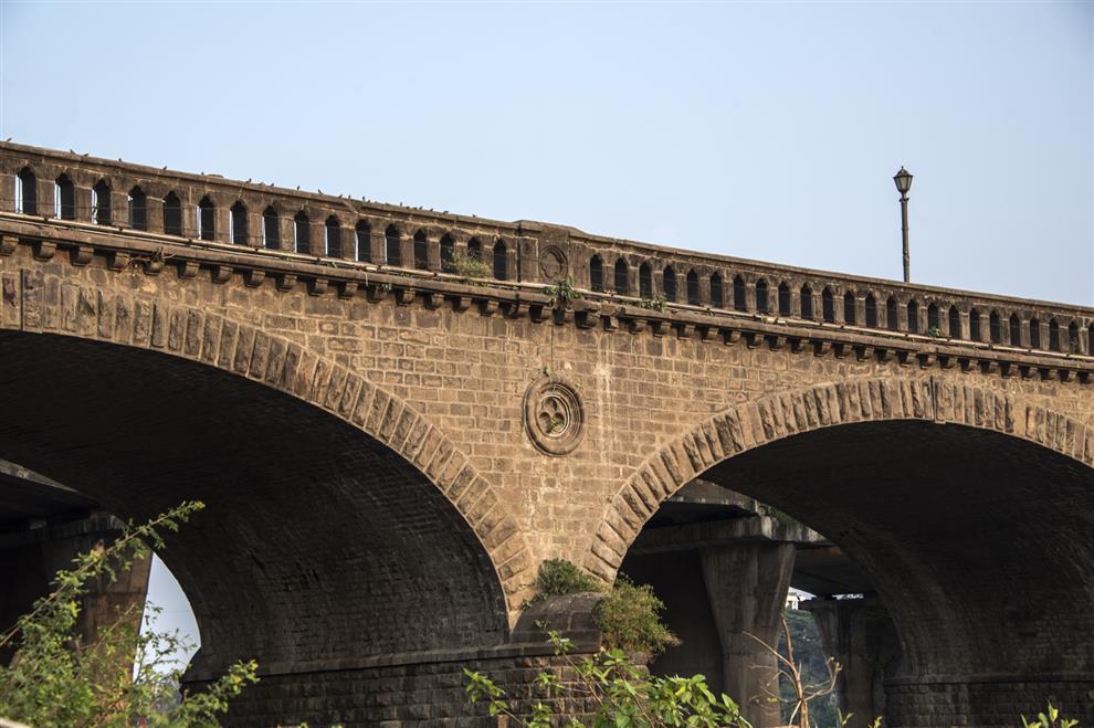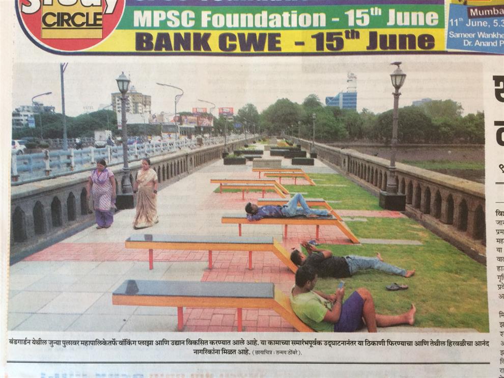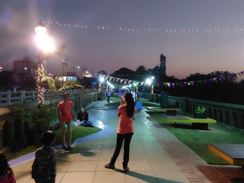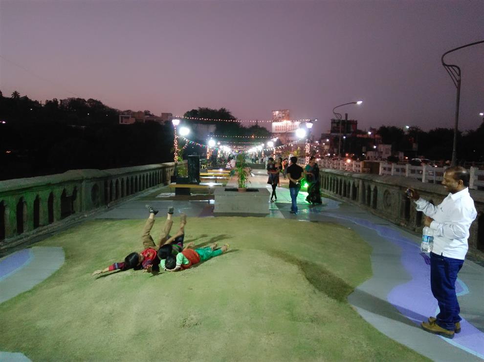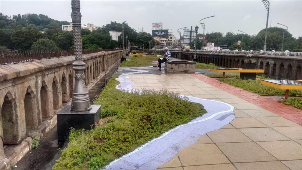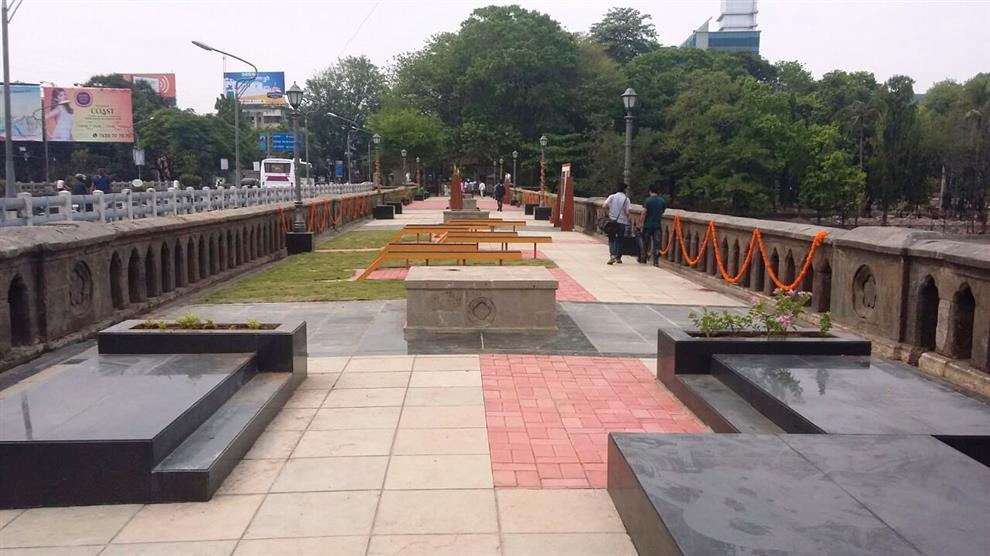 The design of the arts plaza involves visually dividing the 275 m long and 8.75 m wide bridge into 13 bays of 27 m length each, using divider strips of about 3 m each fitted with a 1.5 m wide low height, re-used stone podium or ‘katta’. While some of these kattas are designed as seating, others bear planters of tough flowering plants like bougainvillea and yet others have water pools to create experiential variations. Having thus been divided, the 13 bays, paved with a variety of stones, tiles, sand spreads and grassy lawns and some even provided with seating, are available for hosting of activities like art congregations and displays, workshops on sculpture, pottery or even kite making and photography, and also music recitals. The heritage value of the venue is acknowledged by features like the colonial style CI lamp posts and the stone ornamentation on the katta reflecting that on the bridge’s original railing. Quaint highlights are provided by elements like the blue tile mosaic adorning the central bay to symbolise the confluence of the twin rivers! An old, drab and defunct bridge has indeed been infused with new life in this avatar as a public promenade throbbing with life and art, by a design that is as harmonious as the nature surrounding it, as rhythmic as the arcade of the bridge’s bastions, and as simple as it is useful.