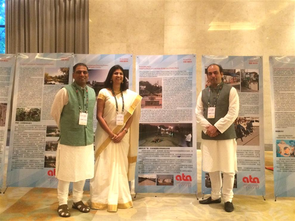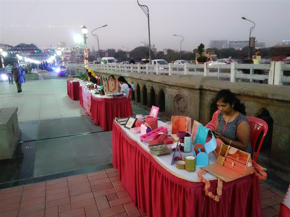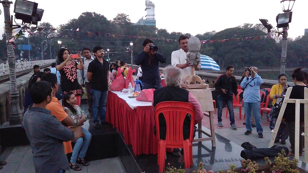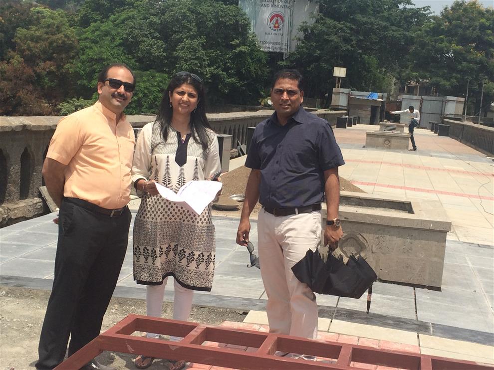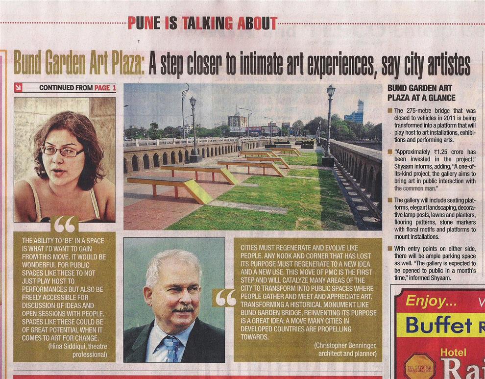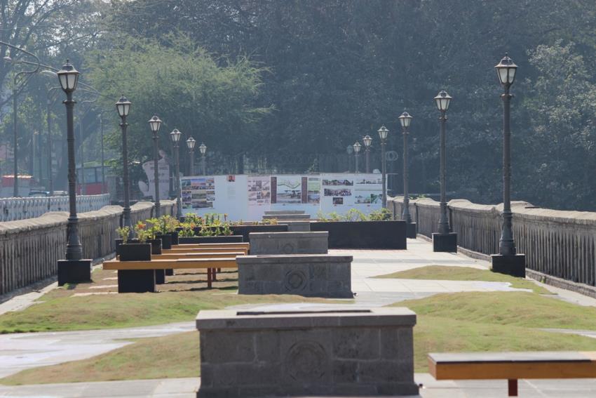The design of the arts plaza involves visually dividing the 275 m long and 8.75 m wide bridge into 13 bays of 27 m length each, using divider strips of about 3 m each fitted with a 1.5 m wide low height, re-used stone podium or ‘katta’. While some of these kattas are designed as seating, others bear planters of tough flowering plants like bougainvillea and yet others have water pools to create experiential variations. Having thus been divided, the 13 bays, paved with a variety of stones, tiles, sand spreads and grassy lawns and some even provided with seating, are available for hosting of activities like art congregations and displays, workshops on sculpture, pottery or even kite making and photography, and also music recitals. The heritage value of the venue is acknowledged by features like the colonial style CI lamp posts and the stone ornamentation on the katta reflecting that on the bridge’s original railing. Quaint highlights are provided by elements like the blue tile mosaic adorning the central bay to symbolise the confluence of the twin rivers! An old, drab and defunct bridge has indeed been infused with new life in this avatar as a public promenade throbbing with life and art, by a design that is as harmonious as the nature surrounding it, as rhythmic as the arcade of the bridge’s bastions, and as simple as it is useful.