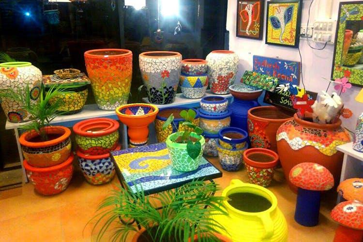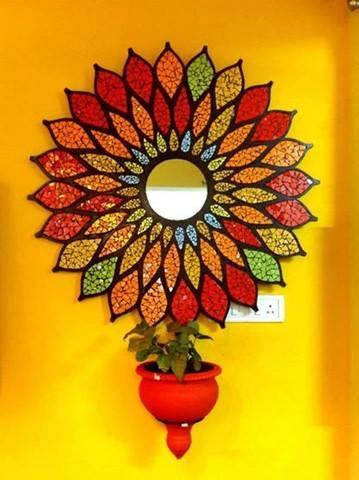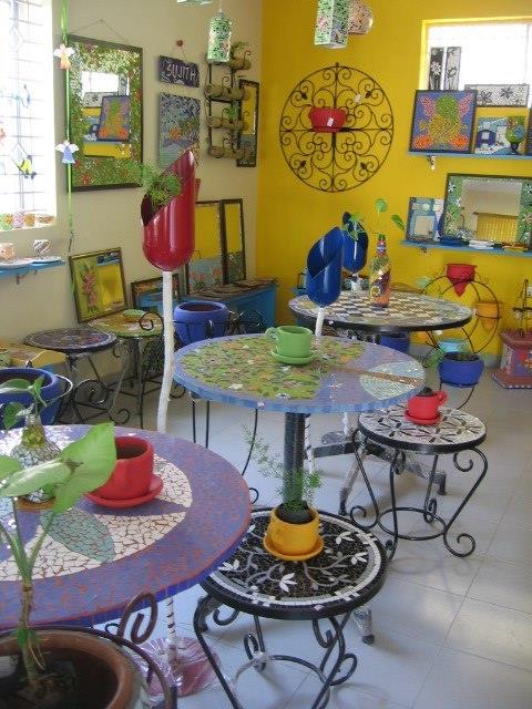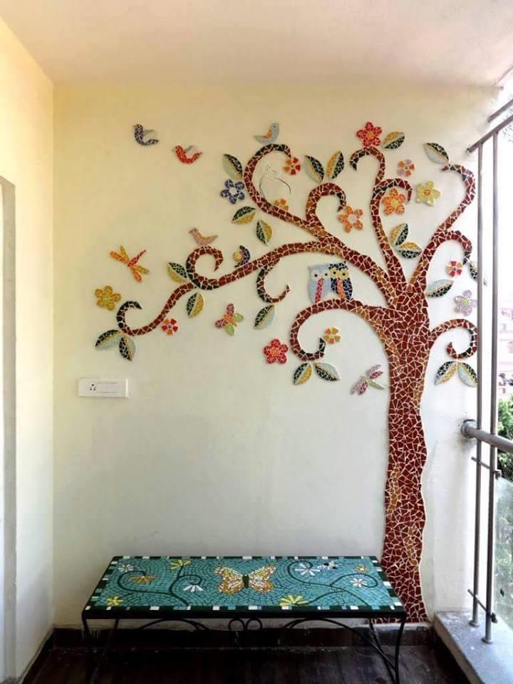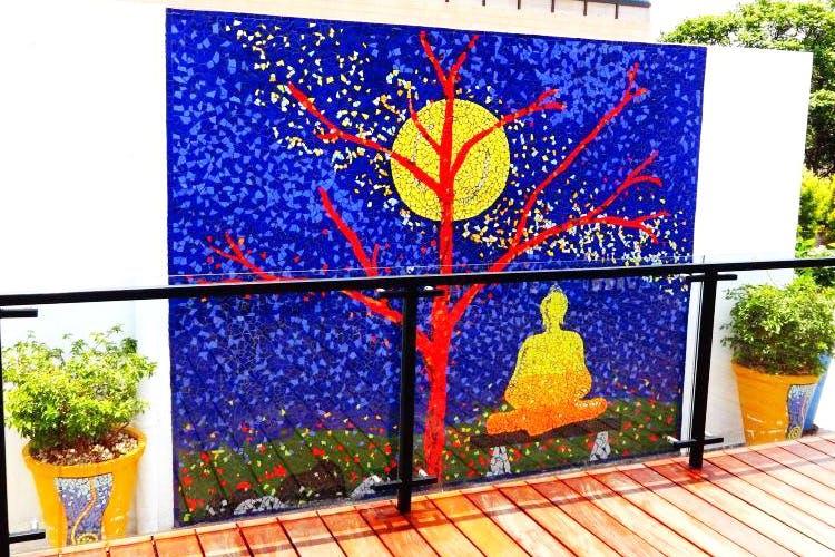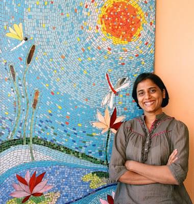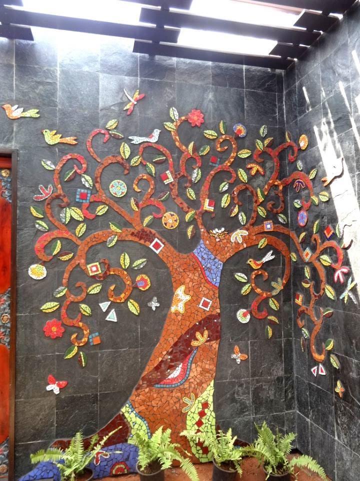 Sara Kurien’s journey into mural art, however is as colourful as the murals she makes! An engineer by qualification, Sara was attracted towards the arts and she did a course in stained-glass painting. One thing led to another, and she eventually started exploring other art forms. Murals, apparently, caught her fancy – and she started creating beautiful pieces with glass and ceramics, and became a self-taught mosaic artist. Soon, she built up a veritable collection.