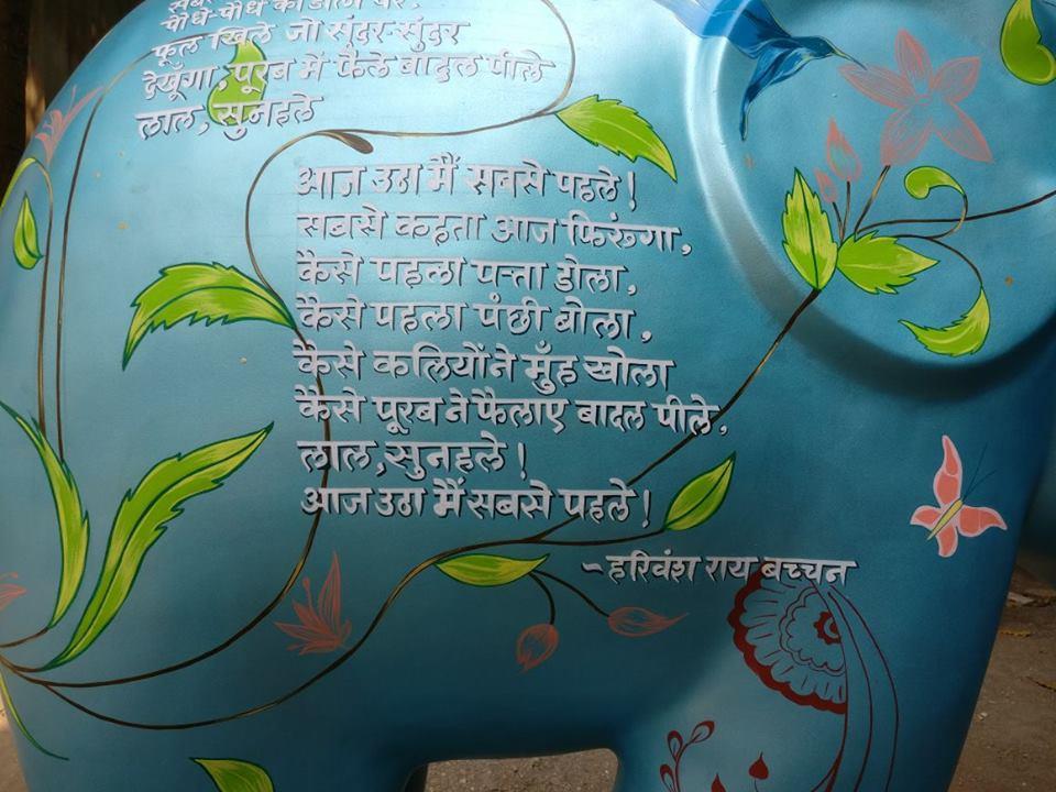 Curated by Art consultant Farah Siddiqui, the art-show has succeeded in bringing together creative people from varied walks of life. Fine arts, folk art, tribal art, design institutes, product designers, architects, interior designers, fashion designers, fashionistas, theatre artists, and film personalities – all have collaborated in this fine venture. It is indeed a delight to see Amitabh Bachchan creating this blue elephant with botanical art and an inscription of one of Shri. Harivanshrai Bachchan’s poems; and proudly sharing it on all his social media handles.