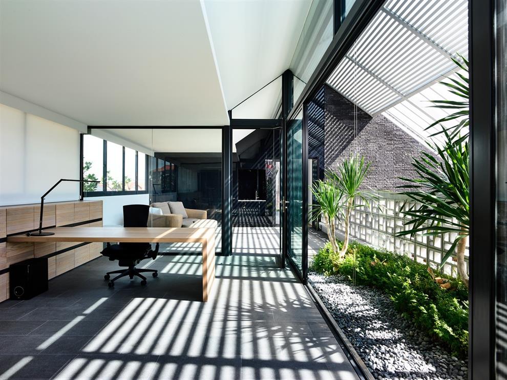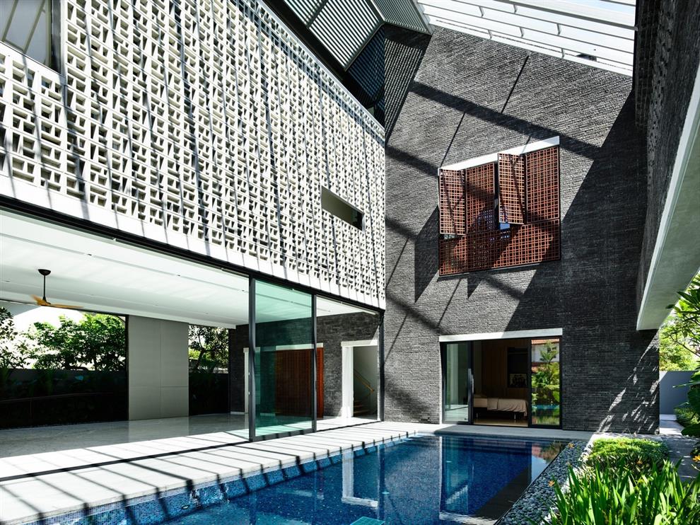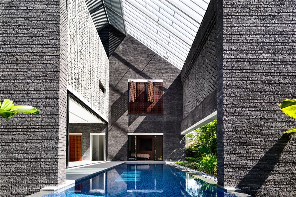 So many different ways and means have been explored to weave outdoors and indoors into a composite whole, framed in the beauty of exquisite textures which include the warmth of large wooden windows among the cold grey of brick and concrete, which make this Singapore home an experiential delight!