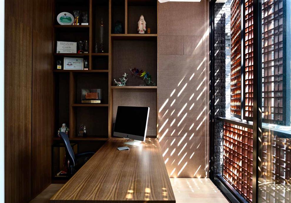 The home, basically, has a large pool running along the entire length of its building and a little beyond, and the green running alongside it goes around the house and even inside, making appearances in patches along the stairwell wall or in passages, rooms and other areas. The grey brick wall that is essentially the external wall seems suspended from a beam three storeys above as it stops half-way down the lowest level to let the garden slide in from below itself. The porosity resulting from these arrangements not only incorporates a green view but also plenty of daylight and fresh breeze in every part of the house.