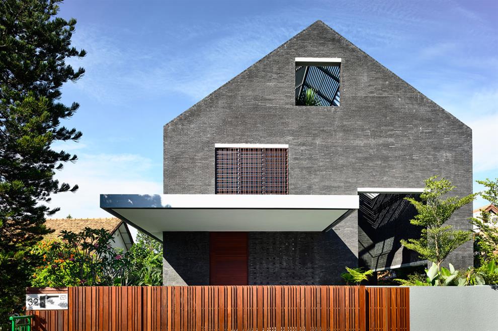 The wall is beautifully textured by a simple intermittent omission and protrusion of single bricks, and competed by the pattern of the enormous perforated pre-cast concrete panel that screens the entire length of the upper floor of the residence, again stopping way short of meeting the ceiling to retain the sense of uninterrupted continuity between outdoors and indoors.