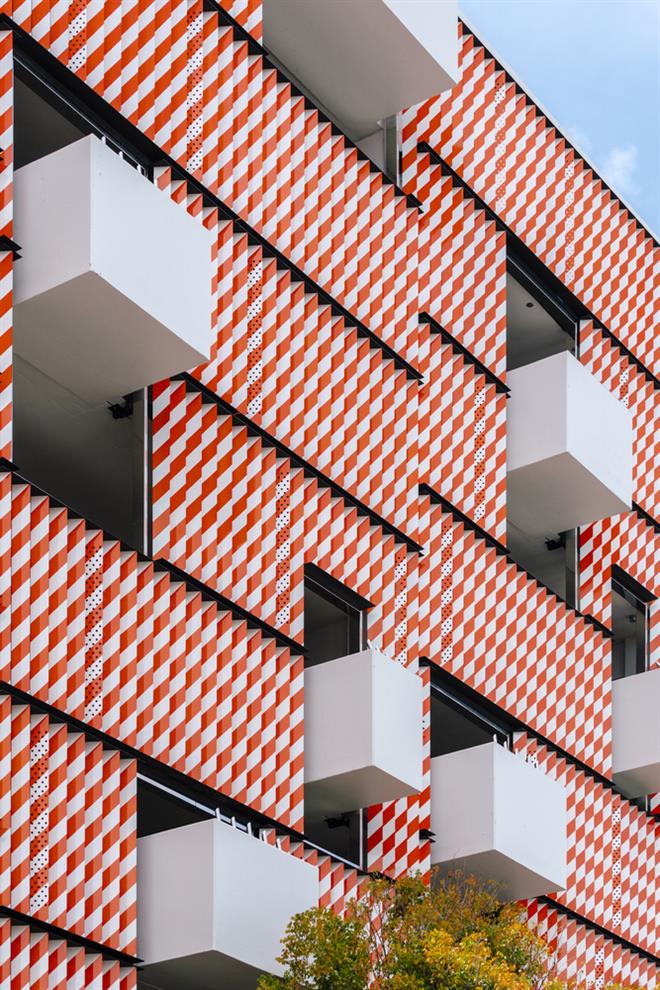 The project and district developer studio Tim Haas commissioned Terence Riley of K/R Architecture to create a bold façade for the parking structure. Riley, in his turn, got inspired by the surrealist parlour game Cadavre Exquis (translated as Exquisite Corpse, where multiple artists create their own pictures in mutual oblivion such that their pictures finally come together on a single surface to form a single artwork), and invited four other architects viz. WORKac, Jurgen Mayer H, Clavel Arquitectos and Nicholas Buff, asking each of them to design a part of the façade.