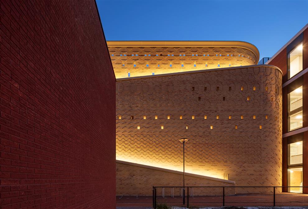 This is another charming example of making the best aesthetic showcase of a public utility. Of course, it is located in the Netherlands, so the sense of design finesse displayed is hardly surprising. But, the unexpected lies in the choice of style or theme, wherein the parking structure is enveloped in the folds of an eastern fortress, invoking the Caravan Serais of Asia and Africa. The structure designed by DOK architects has a brick façade textured varyingly in five different and subtle patterns, accentuated effectively by spotlights after dark.