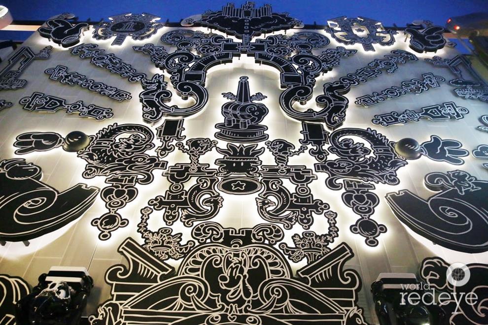 Resultantly, on the NE corner of the building we have the meeting of two types of façade designs – WORKac’s ant farm inspired curvaceous pink screens are like pieces of a giant jigsaw that reveal the lending library, garden, playground and other interiors in parts and J Mayer H’s aerodynamic shapes and colourful designs of perforated screens in interlocking patterns that are part of his façade design labelled XOX (hugs and kisses). Adjacent to this is the façade work called Urban Jam by Clavel Arquitectos which comprises 45 gold and silver coloured cars mounted on a vertical grid with embedded lights, evoking a traffic jam. Continuing where this ends is K/R Architecture’s Barricade – a composition of panels of orange and white striped pattern which is typical of traffic barricades used in the US with panels of mirror steel framed voids with planter boxes jutting out. The façade along 41st street is adorned by French architect Nicolas Buffe’s black and white composition based on Anime, Manga, Baroque and Greek revival imagery including 3D sculptures and gargoyles.