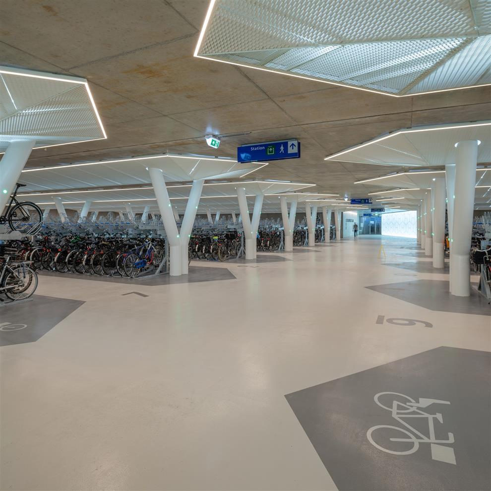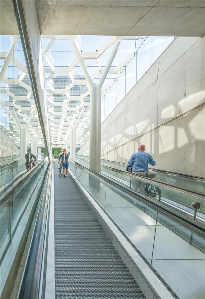 The recently built Strawinskylaan Bicycle Parking near Amsterdam Zuid rail station in the Netherlands is a study in perfection for a state run public utility service – technologically acute, aesthetically sleek, functionally smooth and conceptually simple. A simple 4200 sq m basement structure with a generous floor height of 3.3 m which adds parking places for 3,700 bicycles to the existing capacity in the locality, it can be approached at two different ends. Those de-boarding from trains at the station can completely avoid the road by taking the pedestrian viaduct to their bicycle parking, whereas the main approach for cyclists is from the busiest bicycle path of Strawinskylaan.