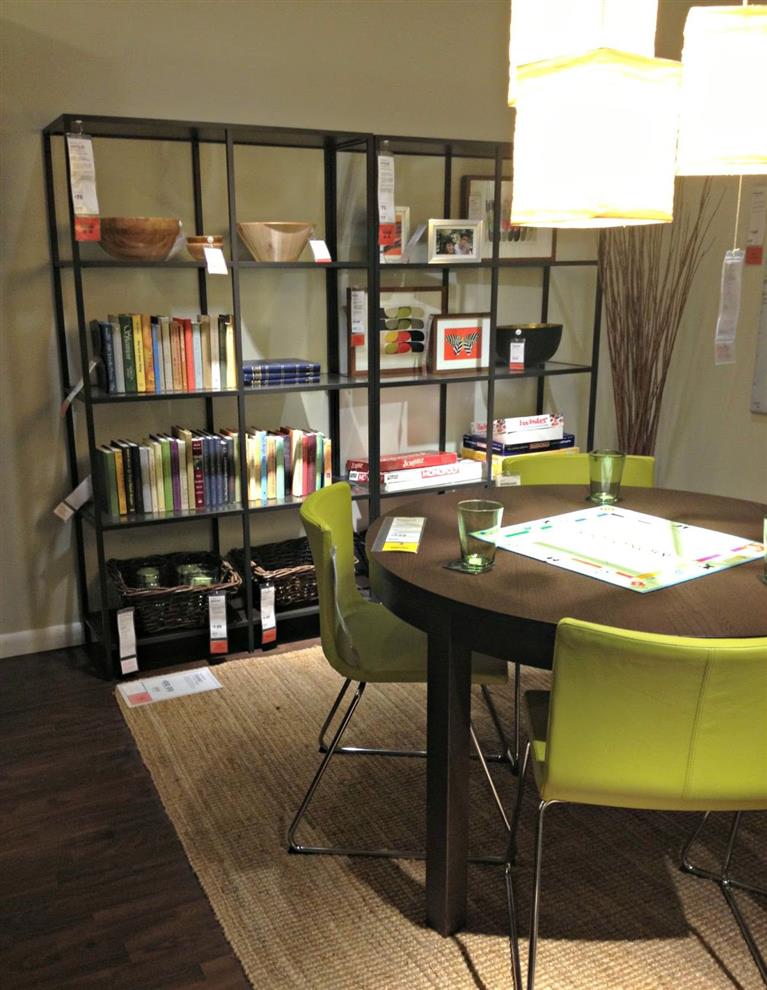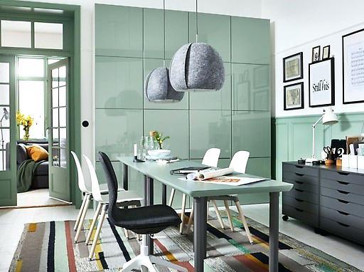 Does this assemblage of a multi-seater table in a green- grey surrounding theme, paired with a chest of drawers and accessorised with large floral lights and a coloured rug double up as a dining space? May be, and the bedroom looks comfortably close as well, weakening the divide between work and rest! Making your work table and dining table switch roles is a very good idea particularly if your work involves frequent meetings and multi-party inputs. This steel storage rack paired with perky green chairs around a basic table laid out on a jute mat (image 2) form an exemplar simple and pleasant set-up. Many times, in fact, your bedroom may be the only place in your home where you can afford to set up your work space and, in that respect, this wonderfully arranged L-shaped work table and ample book shelves mounted on walls next to a cosy, window-side bed look ideal and inspiring.