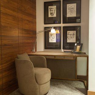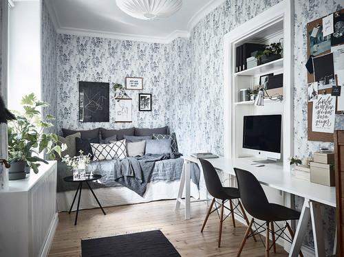 One can have all of a small room or niche, as seen in this case where dark colours and a bold wallpaper highlight a corner of the home being used as an office. Do not miss the neat use of the corner by tucking in all the storage without breaking the continuity with the part that houses the work desk. Or, conversely, one can have a little corner niche like this one fitted into a large room spacious room where the concentration of storage and all other working paraphernalia in a small monochromatic corner near a large window brings the required focus.