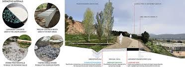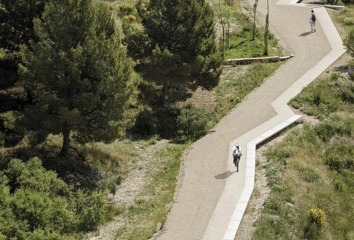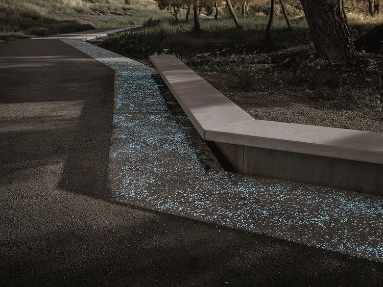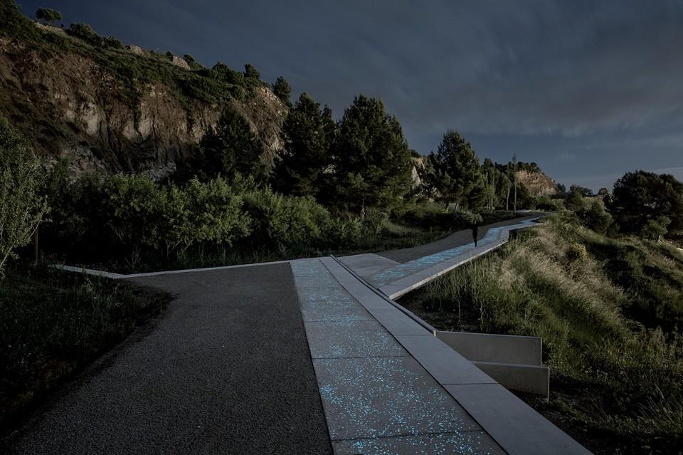 As part of a larger plan to have a peripheral ring of usable open spaces around the city of Barcelona by interlinking several parks, pathways and other green areas, this lookout path comprises a 1.65 km long pedestrian/ cycling track of which 800 metres have been completed. The track which meanders through a variety of greens including a pine forest growing in the area of a former gypsum mine has a tri variant cross section. The three parts include a main 3 m wide granitic sand track to ensure the continuity of the existing green ring. A central ‘lookout’ track of 1.2 m width offers vantage views of Igualada city on the outer edge and is embedded with luminescent concrete which uses the solar radiation absorbed during day to light up the track during night. As the track zigzags around the greens to preserve the biodiversity it widens into shoulders at vantage points where seating is provided. The final vantage at the end of this 800 m stretch cantilevers out over the edge of the cliff.