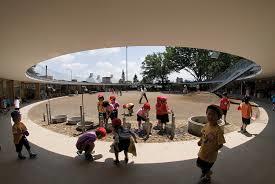 In fact, children playing on the roof get to peep in to the classes below and interact with their friends through the many skylights and nets there. These 600 children of the age-group of two to six do an average of six to eight rounds on the oval roof of 183 metres circumference during their normal course of play, so keeping physically active comes most naturally. In fact, every aspect of this school facilitates whatever comes naturally to human children – run around in circles, clamber over each other to climb trees, peep in and out of classrooms, make noise and function in that noise – as opposed to the excessive tendency for controlled environments and functions these days. That is, perhaps, also the reason why this design still continues to be recognised and celebrated more than a decade after it was built in 2007!