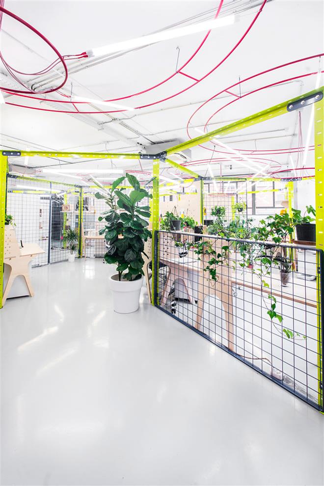 Remember spending childhood summers building fantastic structures using a toy mechanical set on a sunny balcony/ patio/ verandah of your home, surrounded by potted plants and bicycles? That’s exactly the aura which has been re-created by Nacho Martin in the Innovation Lab, using references to Mecanoo sets or even exposed parts of computer hardware. Red, blue, yellow and white slotted angles, bolted into a framework, are spread around to define the space, while CNC-cut boards with holes of different shapes are fitted in to partition different areas. Colourful sheets of wired mesh also fill in to divide spaces and, when accessorised with bicycles and plants, reverberate with a youthful explorative ambience. Playfully appointed workstations and details like dangling wiry spirals complete the creative ambience.