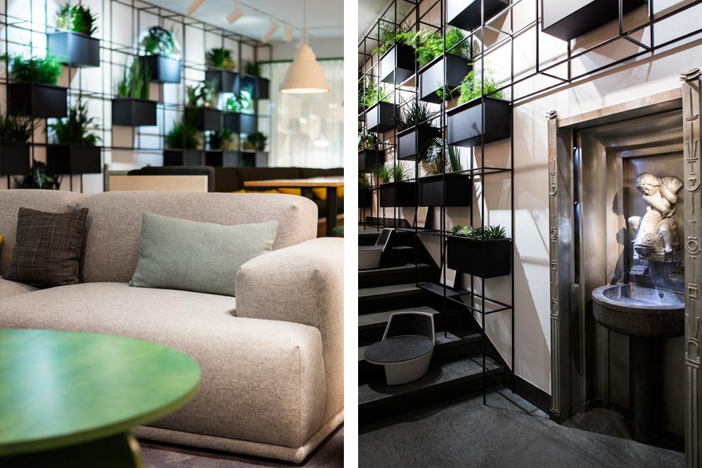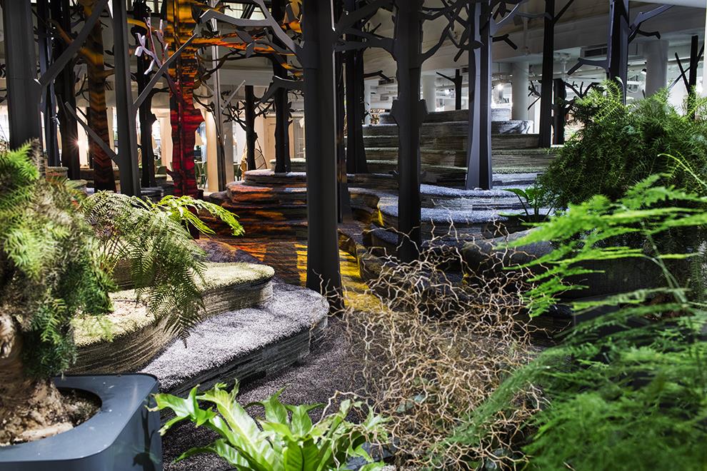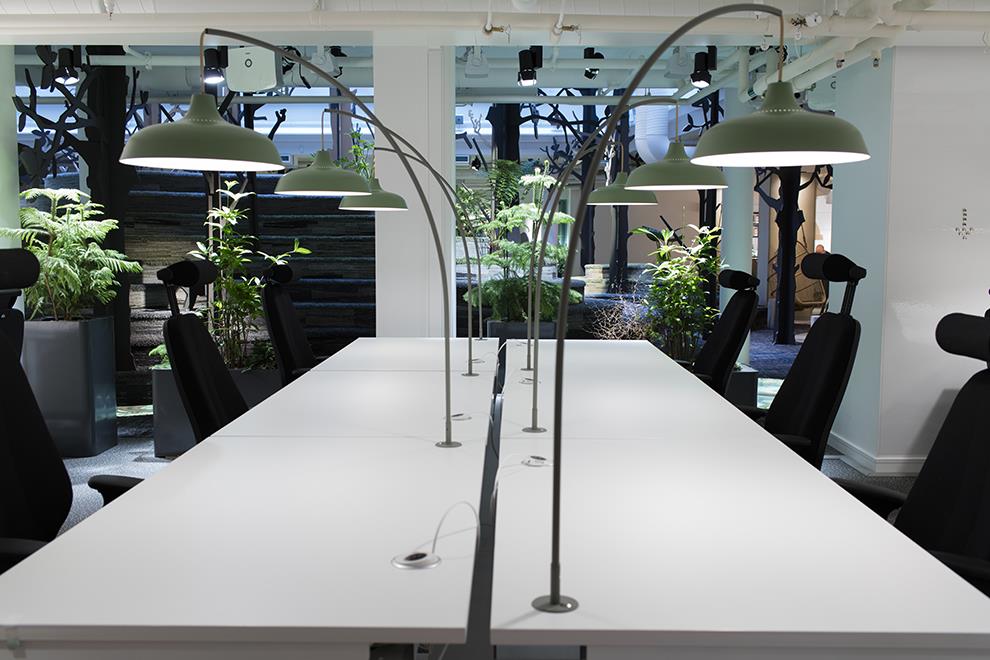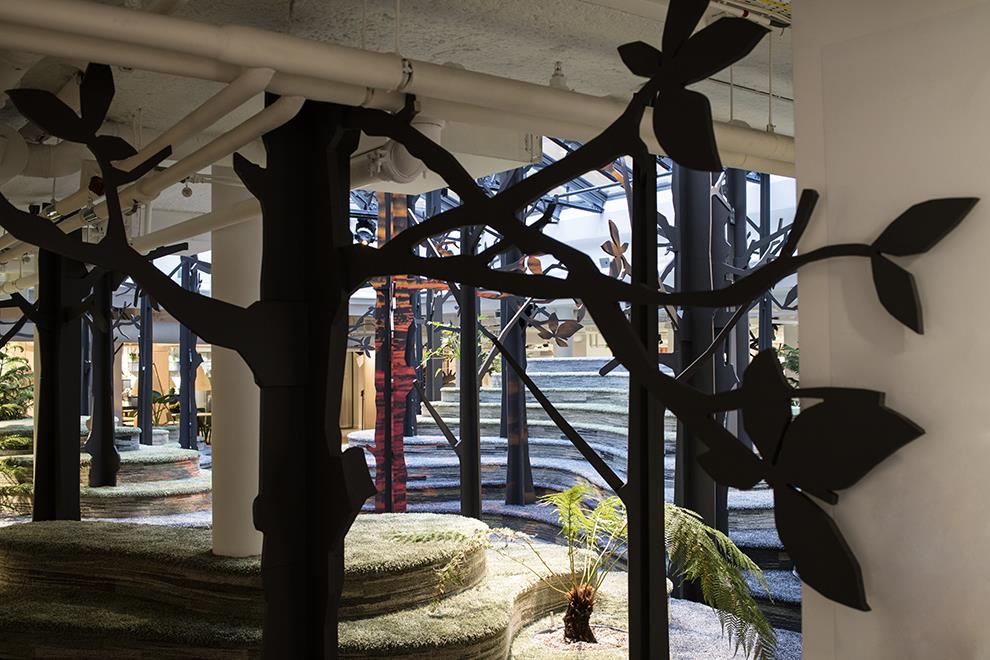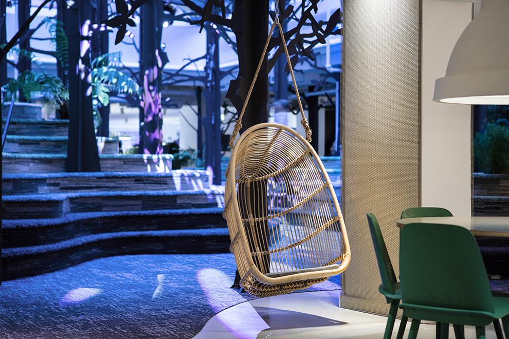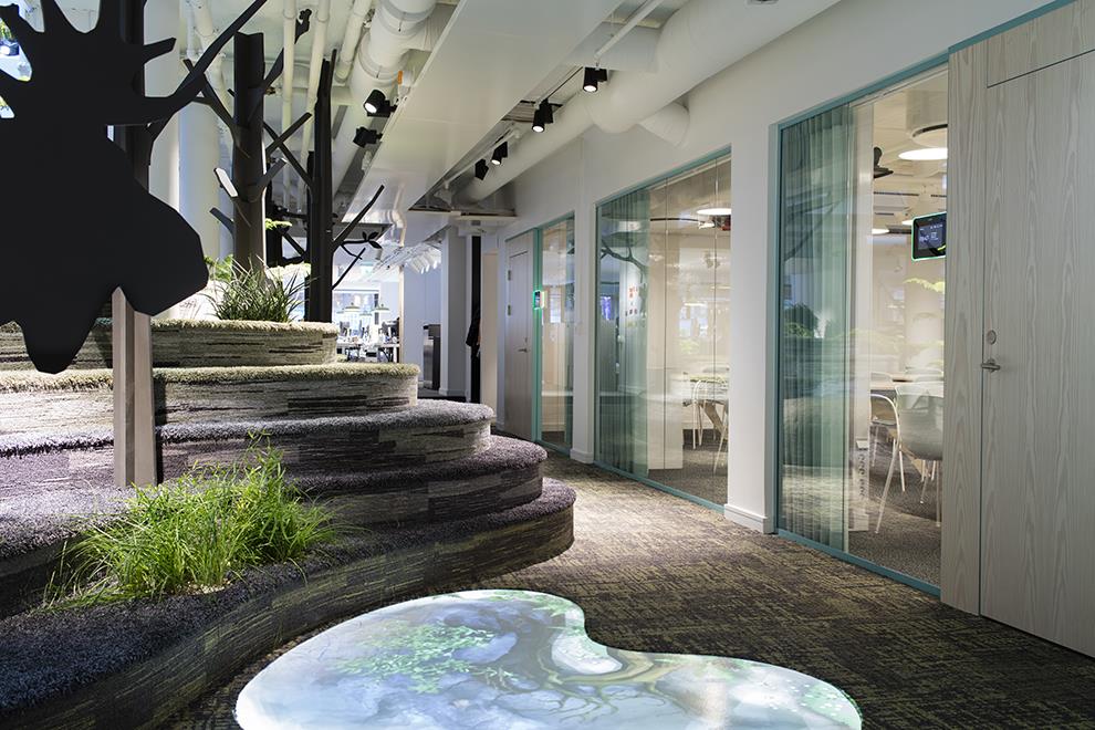 Occupying a huge sky-lit central space of 310 sq m in a total office area of 1880 sq m, the forest terrain emerges from contours made with plywood cut-outs. These are topped and finished with soft cushioning and upholstery that resembles the Swedish countryside of grassy knolls and rocky beds. Artificial tall tree silhouettes are interspersed with natural plants to recreate the flora, while cut-outs of Moose and foxes provide the presence of fauna. The cushioned and upholstered surfaces provide seating, along with some wicker basket swing chairs tucked in to the thicket, where employees can stroll in from the surrounding cabins and cubicles and enjoy working in this natural setting.