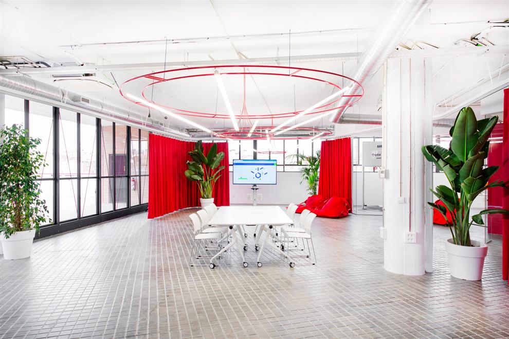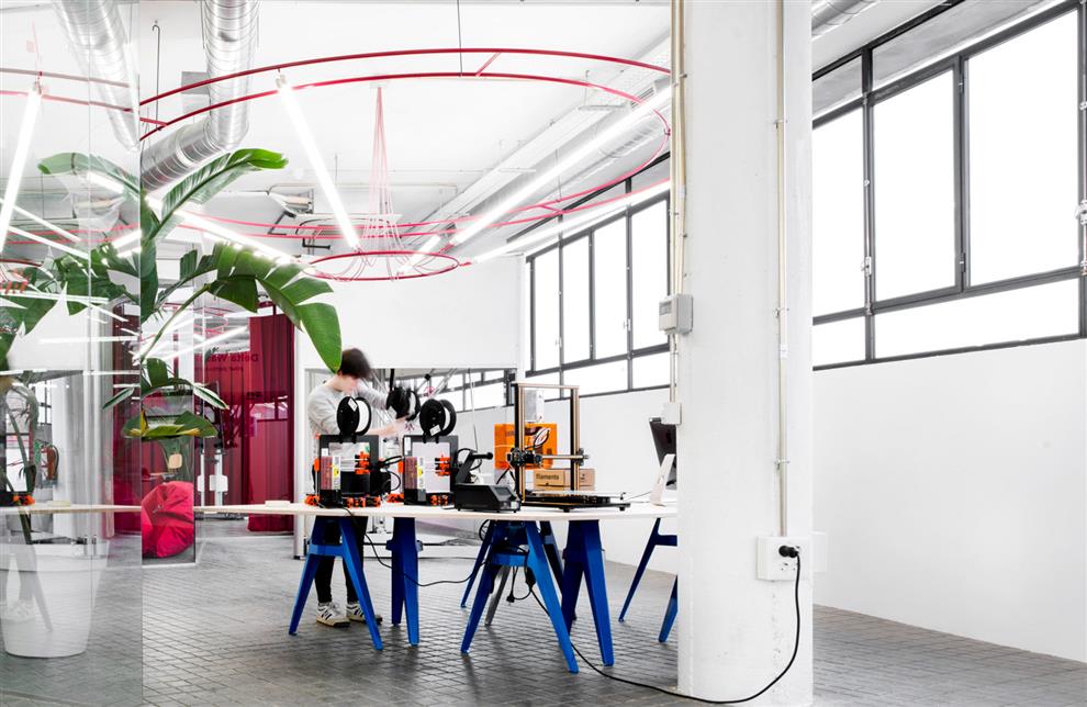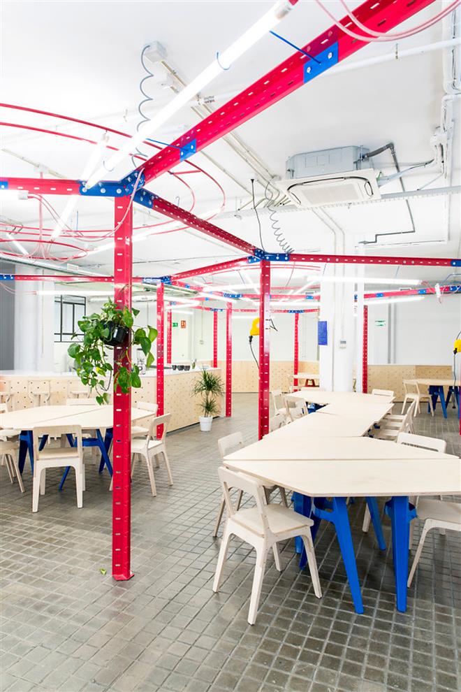 Let not the name ‘lab’ lead to visuals of sanitised enclosures and nerdy sanctity – this workplace is closer to a playroom of fun. The Innovation Lab has been set up by the Istituto Europeo di Design (IED) in Madrid to facilitate innovative endeavours in varied fields. This informs an organisational framework of various labs like the City Lab, the Fab Lab, the Extended Reality Lab, the Food Lab and the Media Lab which work on innovations in their fields and create trial prototypes. The 5000 sq mts of space in a Madrid suburb where this lab is housed used to be an industrial and warehousing facility, which has been brilliantly adapted as the Innovation Lab by designer Nacho Martin’s architectural studio.