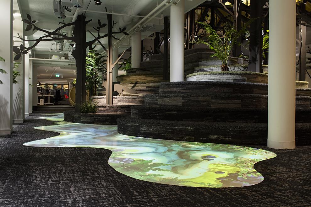 The most impressive element is the interactive floor which mimics a stream flowing through this wood. It reacts to the footsteps of people walking over it and is even programmed to change in appearance with changing seasons, all to the tune of coordinated music. Personally, this three-year-old interior décor concept remains yet unsurpassed simply for the well-calibrated manner in which natural and artificial means have been melded into this successful, magical result. Just imagine nestling on a grassy knoll beside a gentle stream, soaking in the intermittent sun and shade with the wilderness around, trying to lilting music to think up new games for millions of eager gamers – inspiration doesn’t stand a chance of escape!