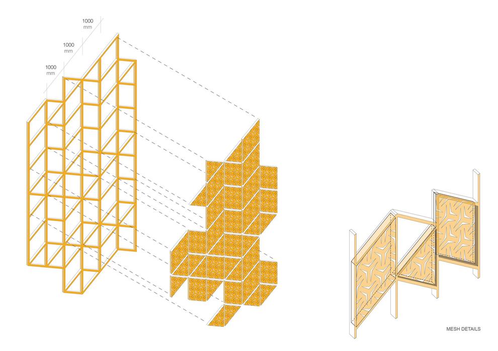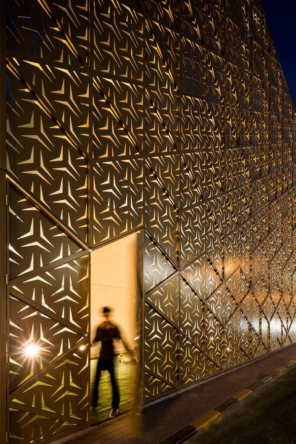 But, this solid façade is punctuated by delicately perforated screen panels which occupy stretches at intervals around the exterior face. Appearing as boxes offset from the surface, the screens are made from anodised metallic plates fitted on metallic frames. Painted in a gold hue and bearing perforations in delicate geometrical patterns, these screens succeed in dressing the structure in an elegant aura, delicately veiling yet securely fortifying the facility. This arrangement of the façade resolves the two primary concerns of privacy and security that were listed in the brief.