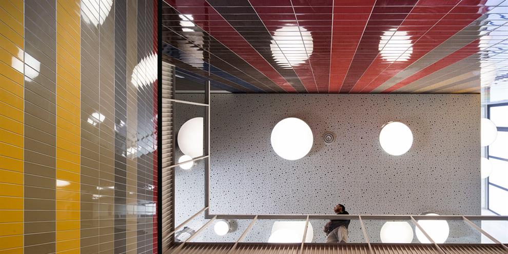 Even as the all-white interior with a speckled dewy ceiling texture sets a comfortable, intimate tone, the large suspended disc lights lend it a cosmic dimension. A huge wall of the reception lobby is adorned with a colourful ceramic tile mosaic which is actually the display of colour codes for various departments. Each of these colours can be followed into the clinic’s interiors as it helps in finding the way to the particular department one wishes to visit even without knowing the local language in which the signage may be rendered. That the colours add cheer to what would otherwise be a cold and sterile environment is only a bonus.