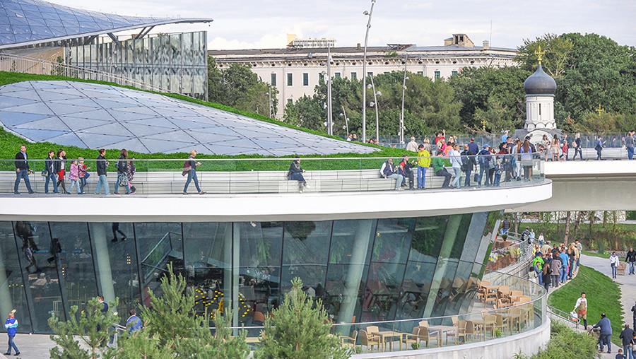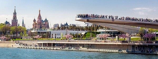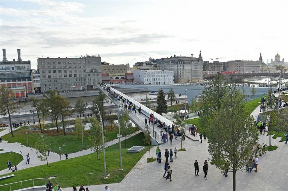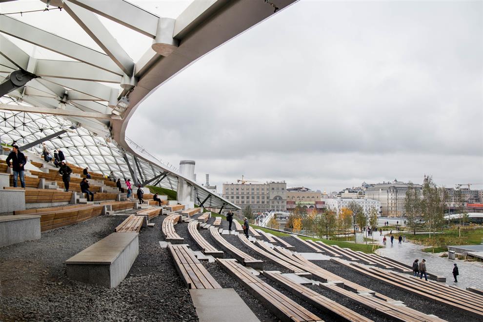 Zaryadye Park is a 10-hectare recreational area built on a heretofore private commercial land of the Kitai-Gorod district in the heart of Moscow city beside the Moscova river. It is surrounded by the most famous landmarks like the Kremlin, the Red Square and St. Basil’s Cathedral, in a sense completing the trail of the city’s tourist hot-spots. Needless to say, the park, with its multi-pronged programme as a nature park, a recreation hub, a public plaza, social space, cultural amenity and educational apparatus, became an instant hit with visitors. The fact that this land, though private, has hosted historically embedded structures like the Soviet era’s colossal Hotel Rossiya and an incomplete Stalinist skyscraper in the past creates its own aura of significance for the plot’s current designation as a public space which occupies 25% of downtown Moscow.