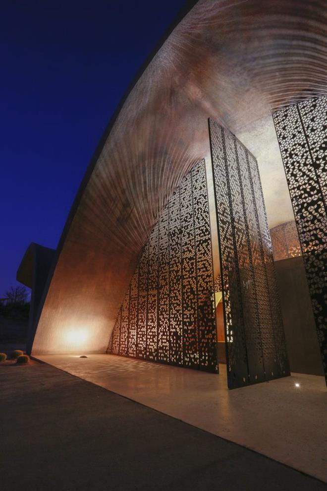 Glazed surfaces and openings sans frames of any kind fixed into the shortcrete curvatures serve a refreshing recipe of material mixes while offering unhindered views of the Jordanian landscape around. Arabic ‘mashrabias’ have been invoked in the perforated and naturally ‘desert coloured’ Corten steel screens laser cut into geometrical designs to filter in some patterned sunlight. It also adds character to the night views of the curvaceous built form with the warm interior lights filtering through these patterned screens like a lit up carved Arabian lamp.
