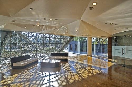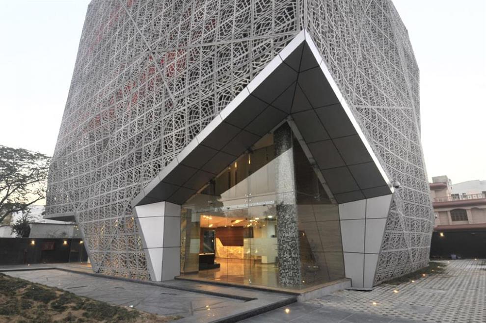 Located in the city of Jaipur, India, the abstract, perforated office building serves as a haven from the area's desert climate. The small structure designed by Sanjay Puri, is energy efficient with concrete screens around the building that create an external space for plants to insulate the building from the external heat of the climate. These glass-reinforced concrete screens take their inspiration from the old traditional ‘jali’ screens of the architectural heritage of the region. They are supported by a steel framework with projections that vary from 0.9 to 1.5m. This creates an external periphery space for plants at each level supplementing an extra level of insulation in the process.