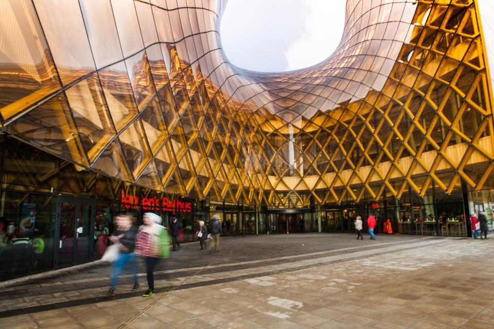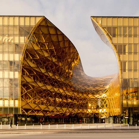 The Emporia shopping center in Malmö, Sweden is an all-inclusive urban planning project that combines offices, housing, and retail together in a mixed-use development- the idea of the project was to hide inward-looking retail behind a wreath of commercial and residential buildings . The shopping centre is the architect's first realized building from a competition-winning master plan of proposed housing and office blocks. A gigantic golden chasm welcomes visitors to this shopping centre in Malmö by Swedish architects Wingårdhs, consisting of three floors of retail arranged along a figure-of-eight plan. Once all the buildings have been completed, the "amber entrance" will be the only section of the shopping centre visible from the surrounding new streets.