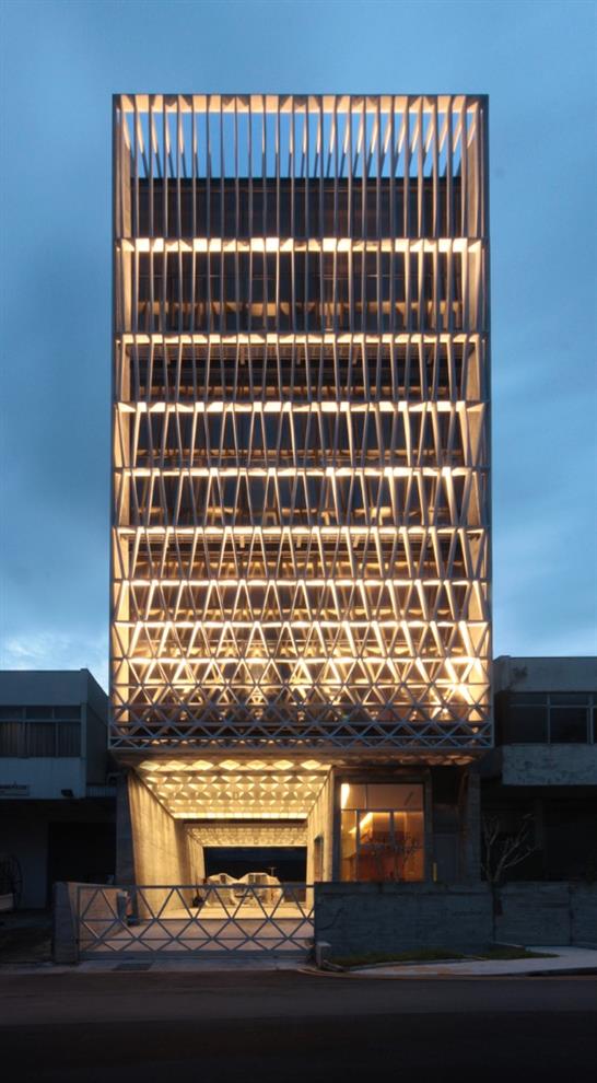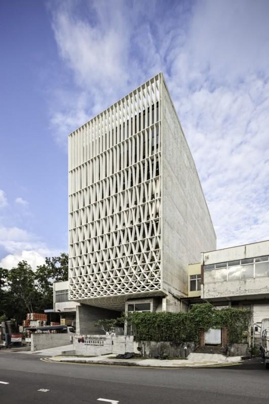 Conceived as a 4 double-story block, a volumetric subtraction is made from the building's centre to create an open courtyard which helps in maximizing natural lighting and ventilation as discussed, as well as function as a hoist space for lifting goods. A sophisticated trellis screen fabricated in lightweight dryvit and galvanized metal is wrapped continuously as a loop around the front, top and rear facades of the building. The pattern exploits the various views of the building, and at the same time highlights a sense of intimacy, by creating privacy for all its inhabitants. From street level, the resulting façade is an anamorphic pattern which creates an illusion of a taller building, which subtly echoes the client’s ambitions for growth with the Chinese idiom- there is steady progress with each step
