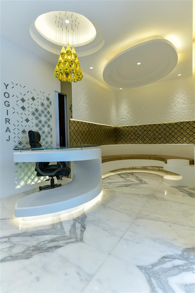 The company “Yogiraj” came with a requirement of creating a unique brand image for itself. This was supposed to be the executive head office space for “Yogiraj” a political worker and builders personal work space. The wanted a glamorous larger than life, modern look (for this 4500 + sq.ft. standalone structure) to establish their brand identity. The building is a standalone and part of the township complex in the “pallava city”-lodha golf-links area. Landscape also has been designed by us to compliment the interiors and create a serene and individuality statement. The building is a ground plus one structure (originally a villa). The ground floor houses the a) reception; b) waiting lounges c) pantry d) conference room e) accounts department and executive cabins. The nature of the business here was only for accommodating executives, meeting areas and a few staff members. The top floor accommodates the VIP areas, the directors’ cabins, personal spaces and anti- chambers. A powerful classy and modern statement is what forms the basis of design. The look spells glamour through and through. The colour white and gold form the highlight of the design. Swirling, dynamic, line and curve flows from the false ceiling to the walls forming an ideal canvas for the design. Corian panels shape the walls. Dynamic colours of leaf green and red are used as splashes along with intelligent L.E.D backlights to create a “wow” feel to the place as one enters.